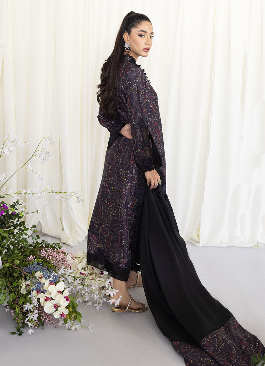 Cut from pure, breathable raw silk, the universally flattering silhouette is a deep onyx hue. Whimsical florals bloom all over the shirt, while the hand stitched 3-D flowers all along the neckline add timeless, easy elegance. The hemline and sleeves are appliqued with embroidered organza, making this an Eid essential. A pure medium silk dupatta with thick printed borders, completes your ensemble for a stand out look.