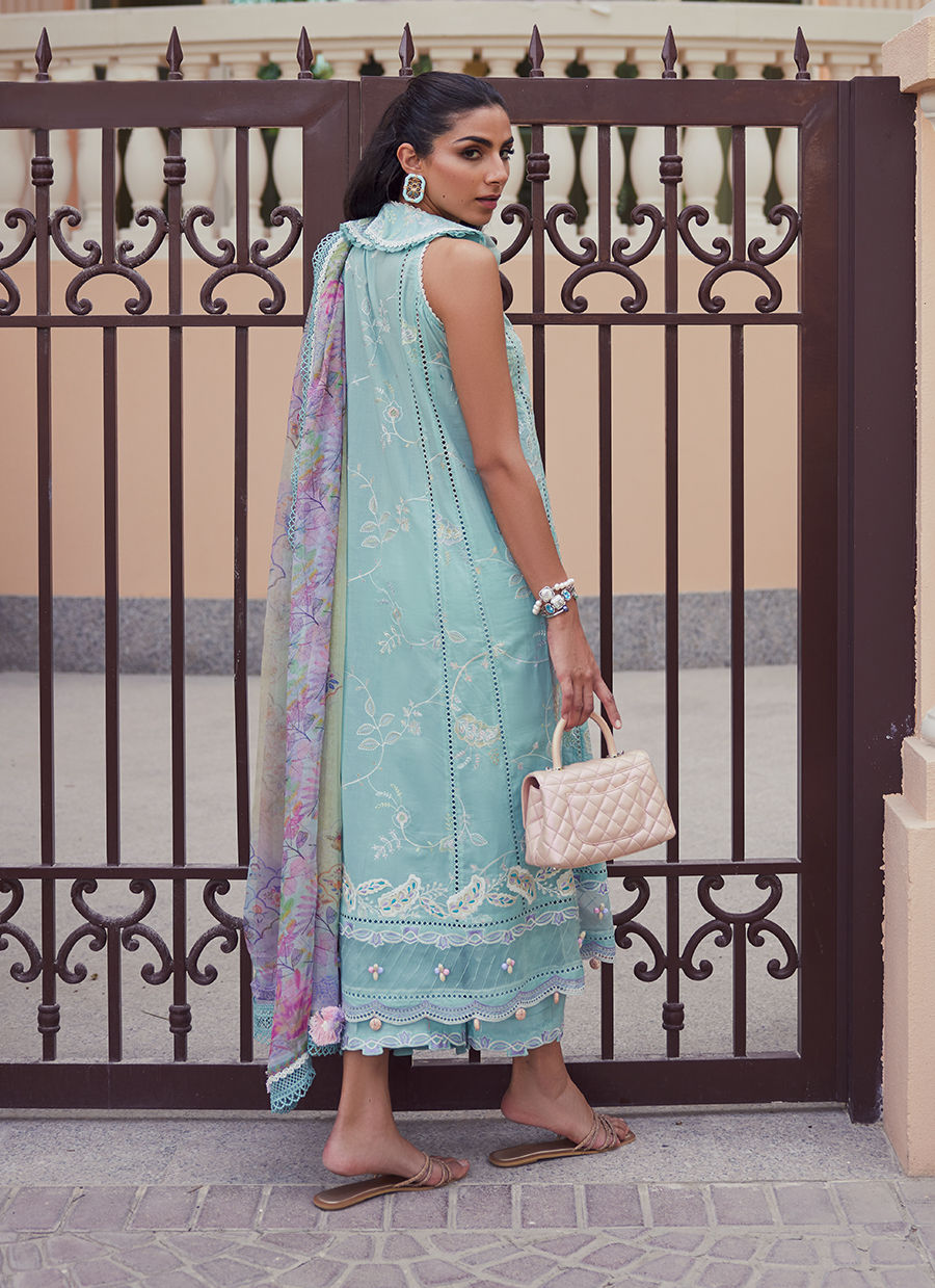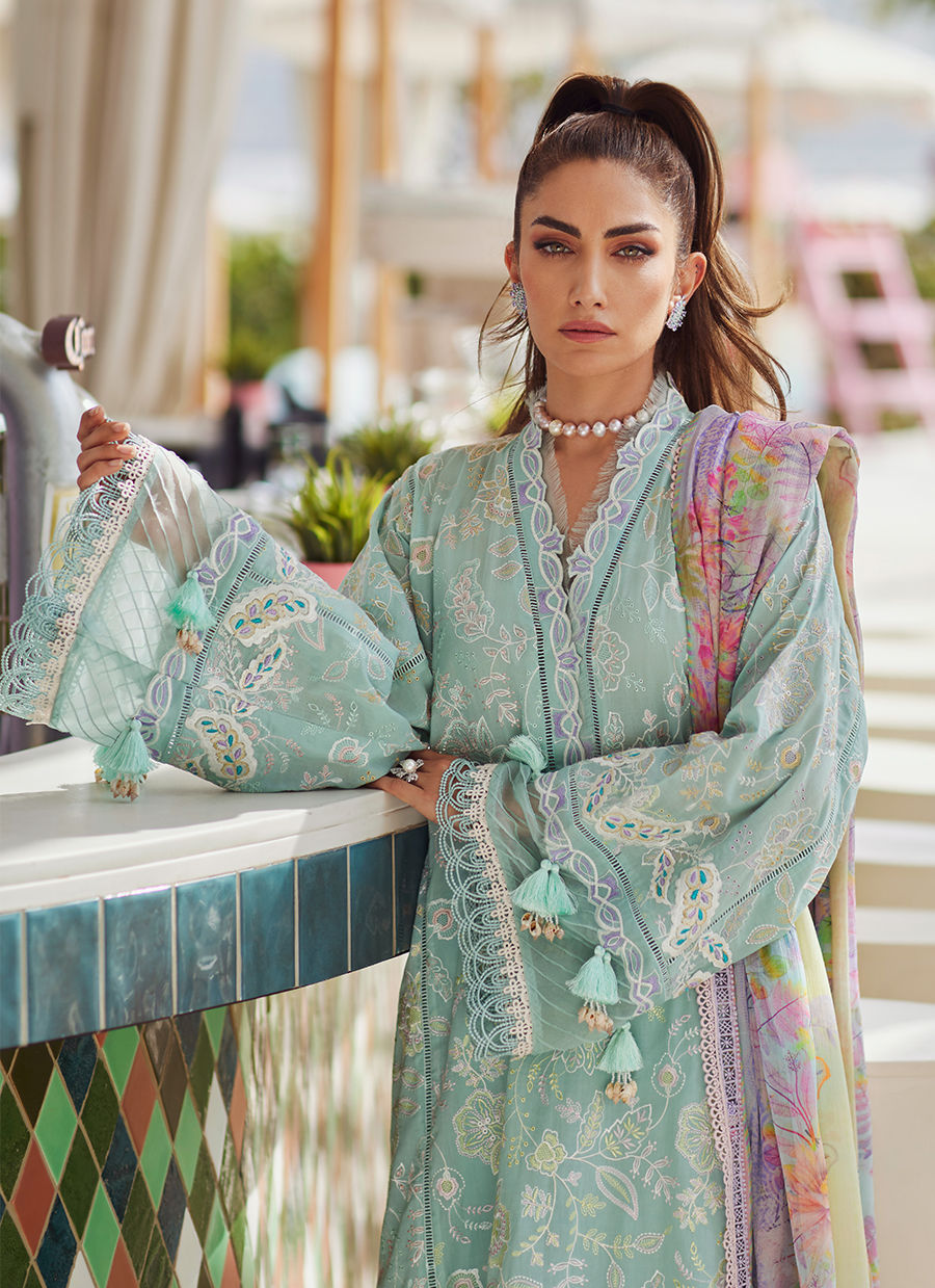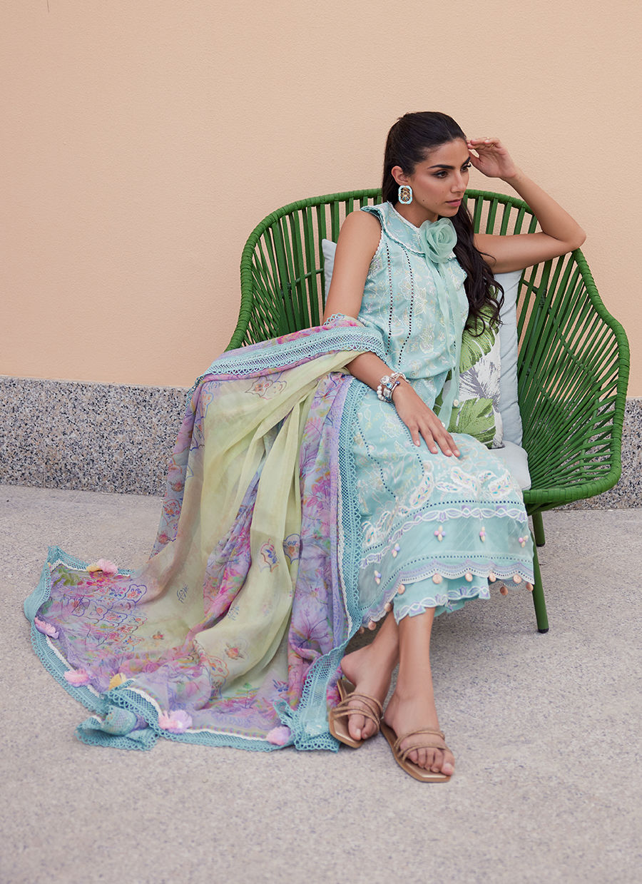An exclusively designed soft PIMA lawn featuring ombré shadow work embroidery on the soothing captivating shade of pale aqua. Pre-Appliqued motif patches highlighted by kacha taanka paired with unconventional embroideries makes an undeniable statement. ⁠ The comfortable, jacquard pants will keep you breezy day or night. The crown jewel of the outfit is the diaphanous Pure chiffon Dupatta in gorgeous soft pastel shades.