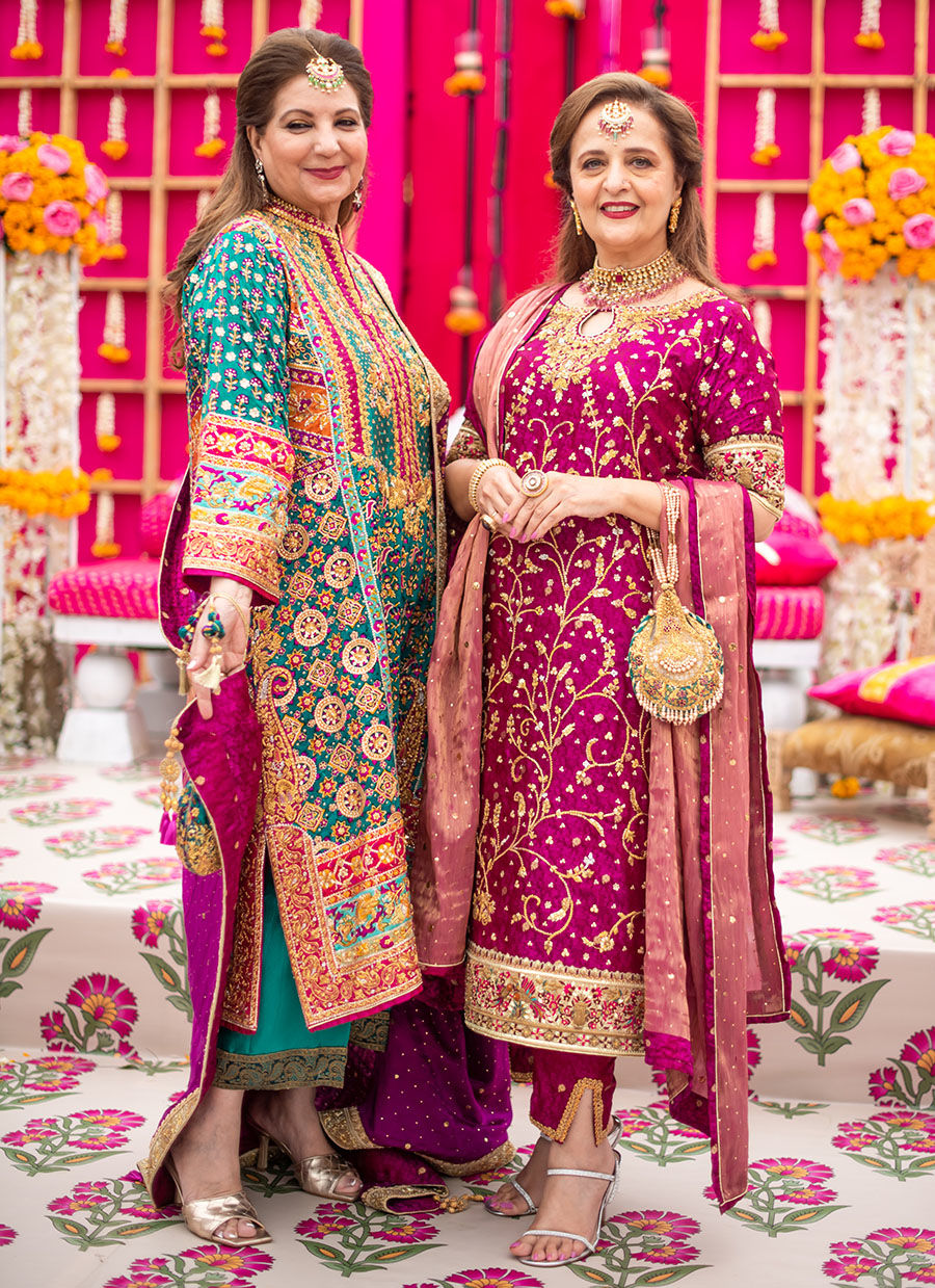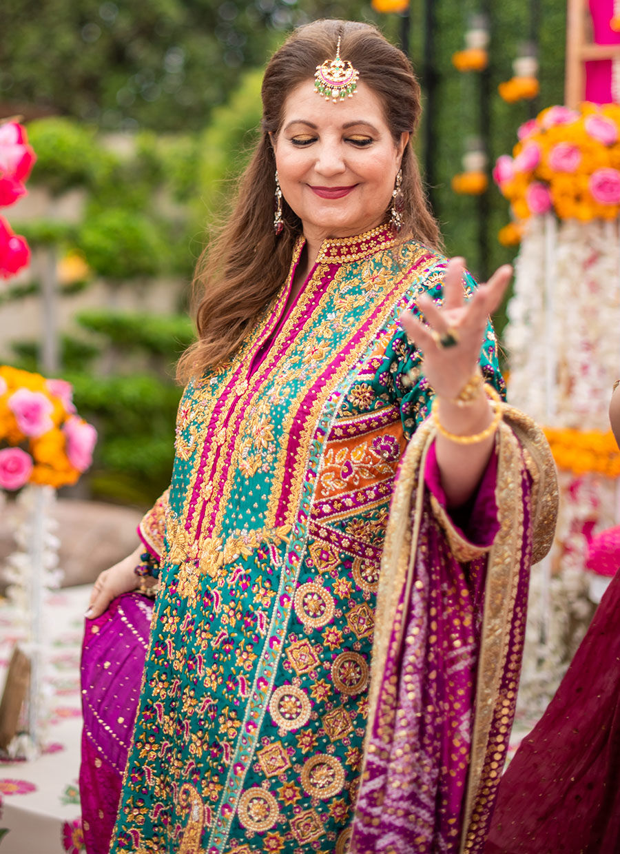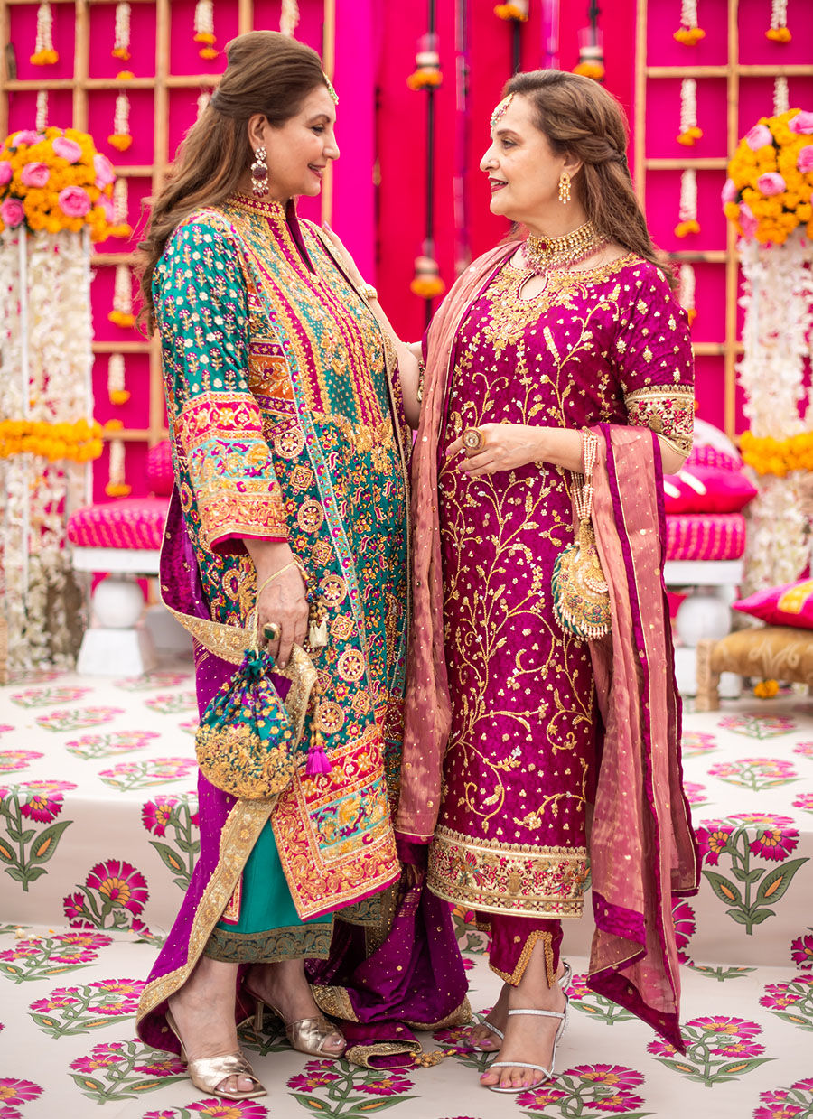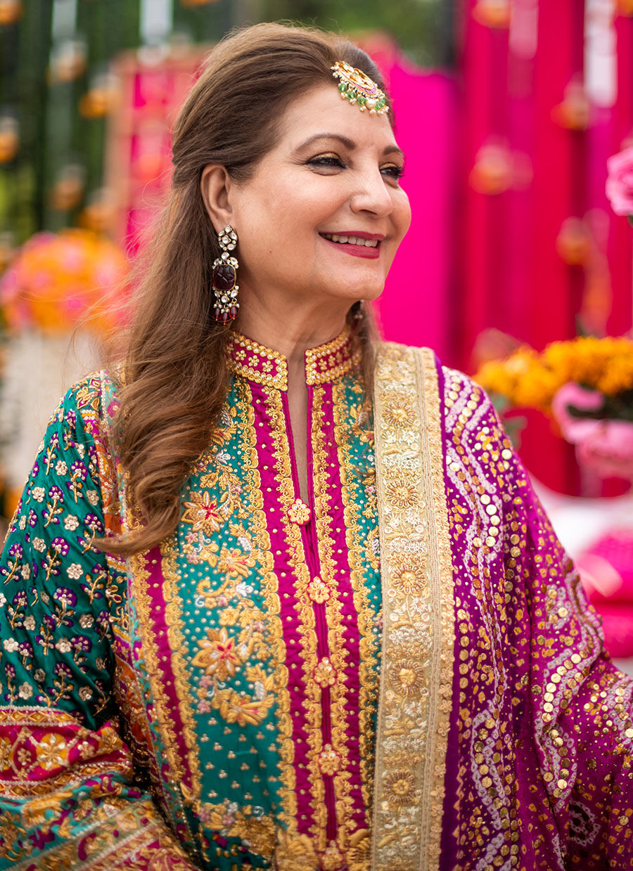 A kaleidoscope of colours on a striking emerald green canvas with intricate floral embroideries as well as playful birds and delicate gota motifs. Appliqués of a myriad joyful shades on pure silk to enhance the zardozi, ari and thread work add a festive element to the outfit. A flattering cut with slits and a “sherwani” neckline make this outfit easy to wear on every body type. The complementing chunri chaddar, made from pure silk (and available in a myriad of hues) drenched in enticingly luminous kaamdaani, as well as an elaborate hand worked border on all four sides – makes for an eye-catching, versatile choice to stand out at any festivity.