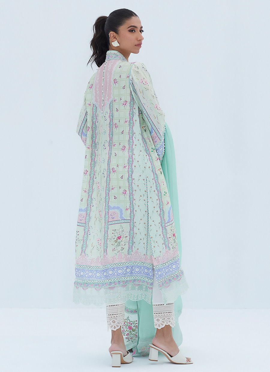 The elegant, straight shirt is paired with a pure medium silk dupatta in light aqua, trimmed with organza embroidered with vibrant blooms.