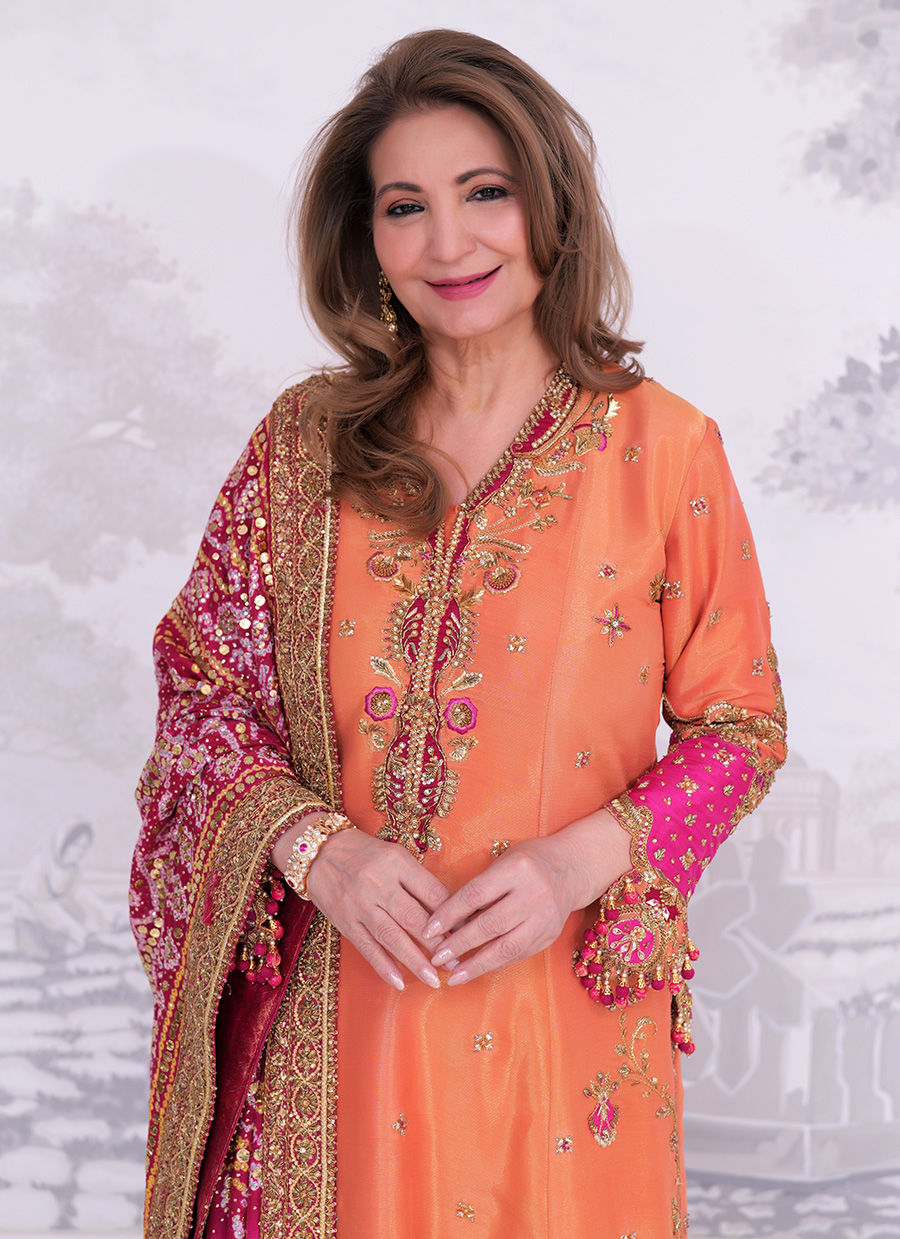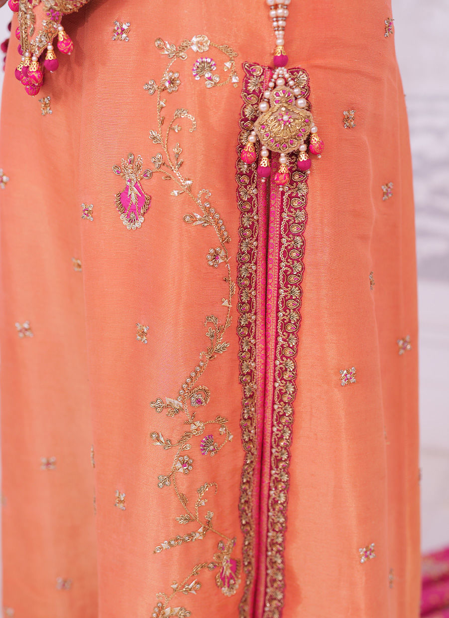 A vibrant ensemble in a radiant sunset orange, beautifully adorned with hand embellishments in resham, zari, and sequins.