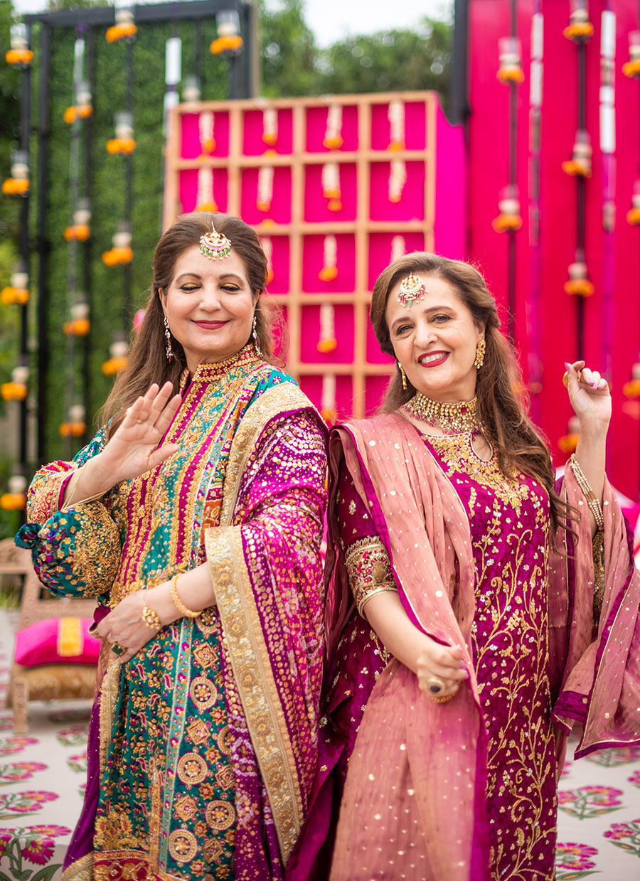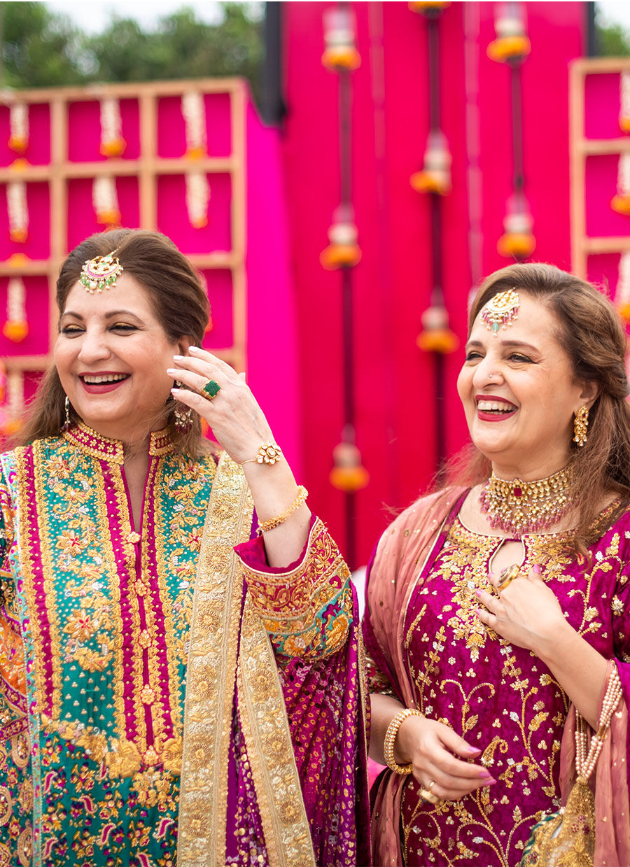 Complemented by a gold zari mehsuri dupatta dyed in a stunning hue, that is embellished with sequins spray, and floral motifs.
