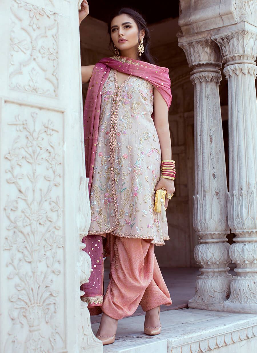 A classic intricately detailed peach ensemble on pure raw silk. The shirt is delicately embroidered with zari and dabka. It comes with an orange ghera shalwar and a pink soft tissue dupatta with border finishing.