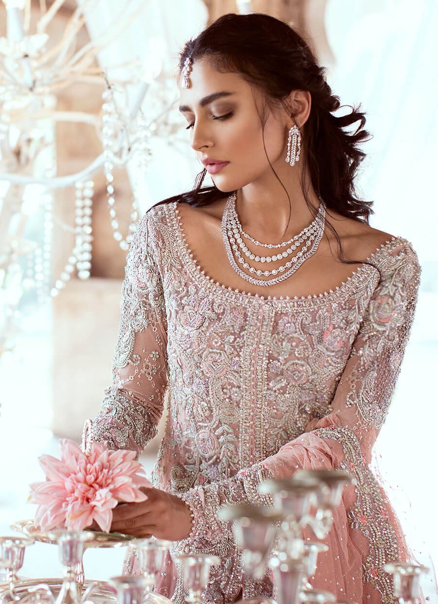 Ethereal bridal couture by Farah Talib Aziz. Full length blush petunia gown worked with 3D flowers, Swarovski crystals and diamantes. The neckline and sleeve edges are finished with pearls. This enchanting piece is paired with a net dupatta decorated with chan and silver border
