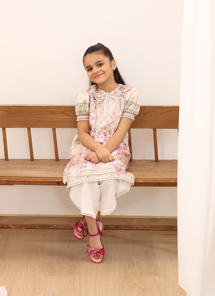 This sumptuous raw silk kurta for young girls is a stunning blend of elegance and whimsy. The shirt is printed with whimsical florals that bloom daintily all over the shirt, making this an absolute must have. The sleeves are finished with stunning embroidery