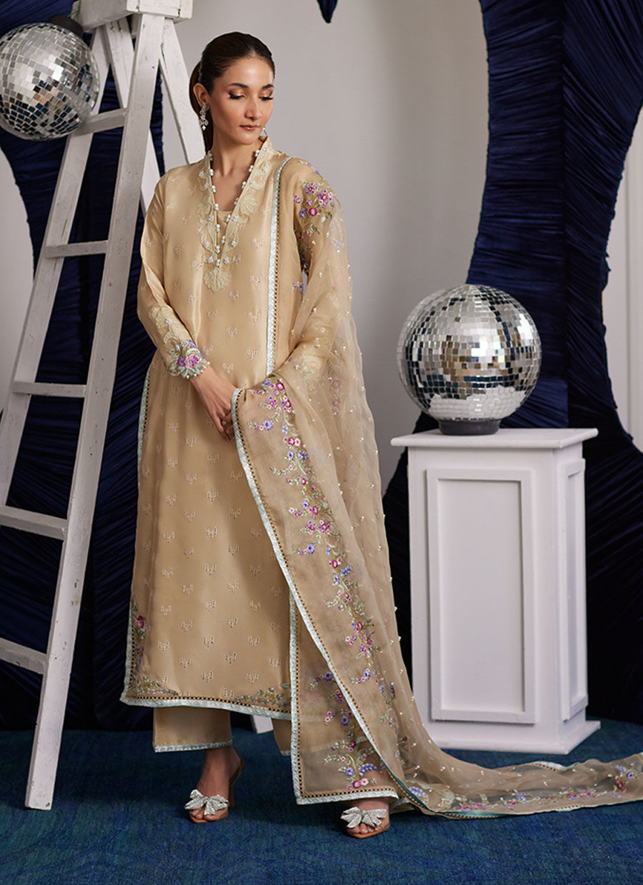 The outfit featuring an embroidered raw silk long shirt paired with an organza dupatta exudes timeless elegance and sophistication.
