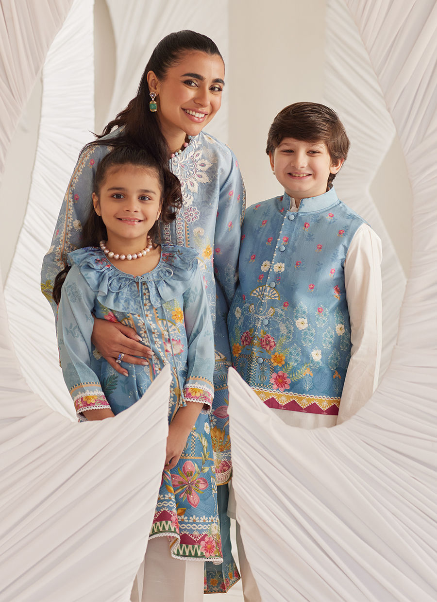 Brimming with signature FTA details, our new prints have the perfect pastel hues to set your heart aflutter!! This slate blue printed raw silk kurta for young girls is a stunning blend of elegance and whimsy.