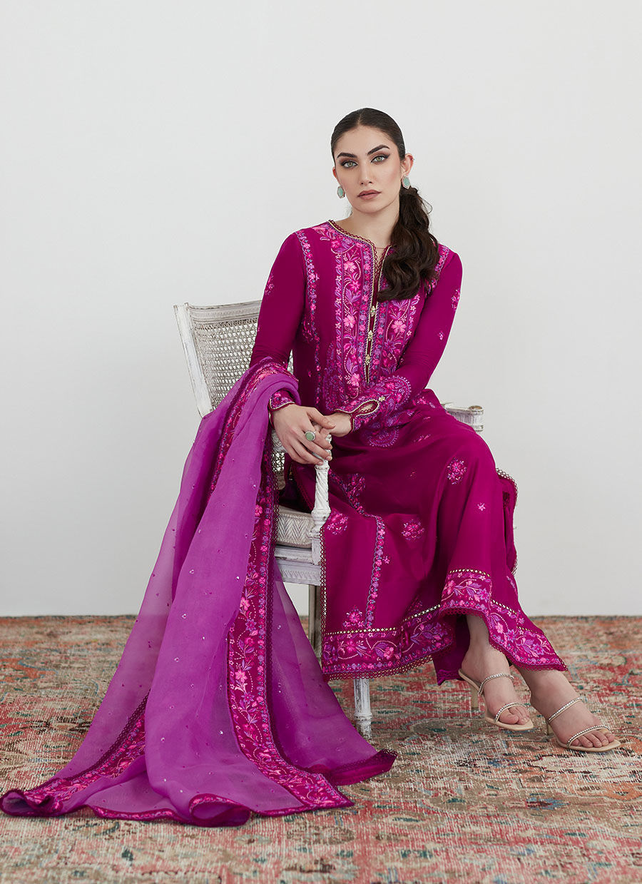 A refreshing shade of fuchsia raw silk is adorned with stunning embroidery all over the front, back and sleeves in shades of pink.