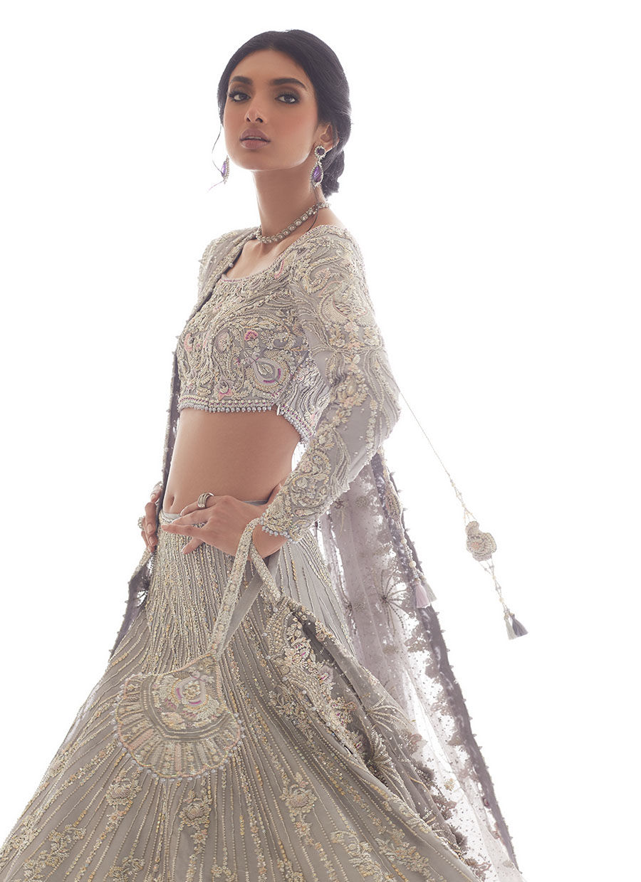 Introducing our mesmerizing Lehnga Choli set, crafted on pure tissue fabric and paired with a delicate net dupatta. The ensemble features exquisite silver and champagne gold zardozi work, creating a luxurious and intricate design. The silver kaamdani adds a touch of shimmer and elegance, elevating the ensemble to new heights. The Lehnga Choli is adorned with hand-embroidered floral details in pale lavender and pink hues, showcasing the skillful craftsmanship of our artisans. The delicate silk threadwork adds a soft and romantic touch to the ensemble. Swarovski crystals and pearl embellishments further enhance the beauty and richness of the design, creating a stunning sparkle. The Lehnga is adorned with an organza ruffle at the bottom, adding a touch of playfulness and movement to the ensemble. The net dupatta complements the Lehnga Choli perfectly, providing a delicate and ethereal finishing touch. It drapes effortlessly, adding an air of elegance and grace to your overall look.