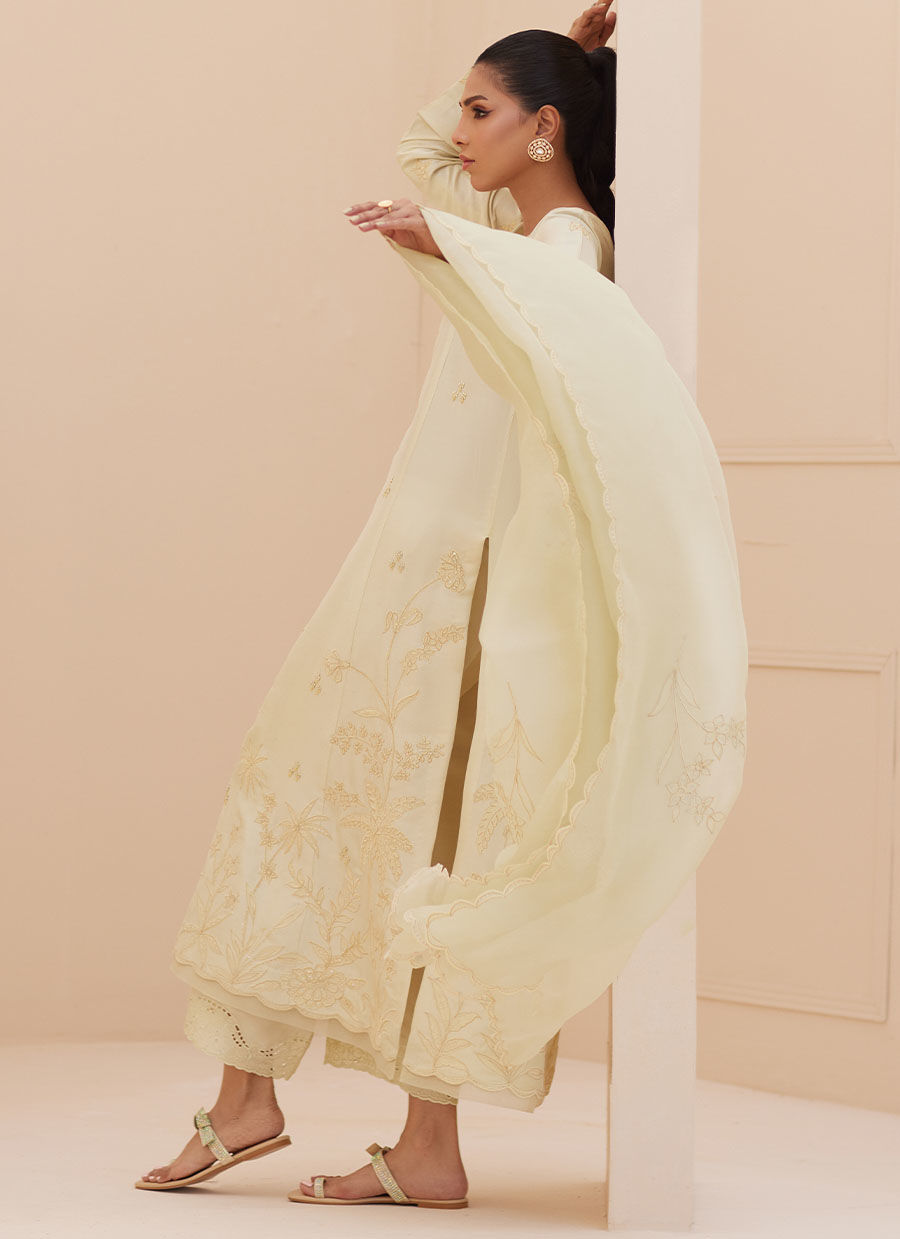 Irresistibly romantic florals, luxe fabrics and captivating details for the ultimate wardrobe refresh. A canvas of pale champagne is adorned with stunning floral embroidery all over the front, back and sleeves in a lovely tonal hue. The relaxed, much-loved silhouette has a universally flattering neckline, is further enhanced with pearls, sequins and rhinestones, hand embroidery. The sleeves feature embroidered floral motifs, organza and lace detailing. A floaty, graceful, organza dupatta with embroidered scalloped borders completes the ensemble. Pair your outfit with our matching embroidered pants (as shown), and minimal earrings for a stunning look, no matter the occasion.