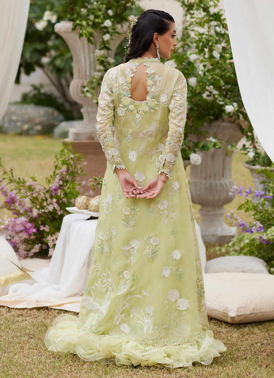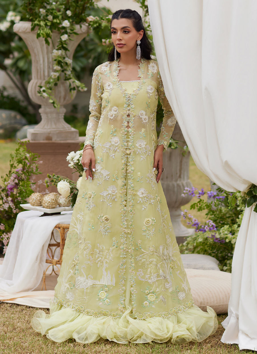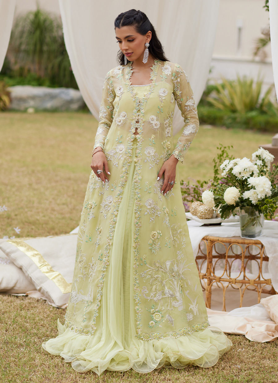 In a gentle shade of pale lemon, this ensemble captures elegance with a contemporary softness. The panelled jacket shimmers with delicate handwork — resham, cutdana, sequins, stones, and appliqué — layered with meticulous artistry. A cutwork bodice enhances the refined detail, while the airy net lehnga flows effortlessly, creating a look that is light, graceful, and quietly luminous.