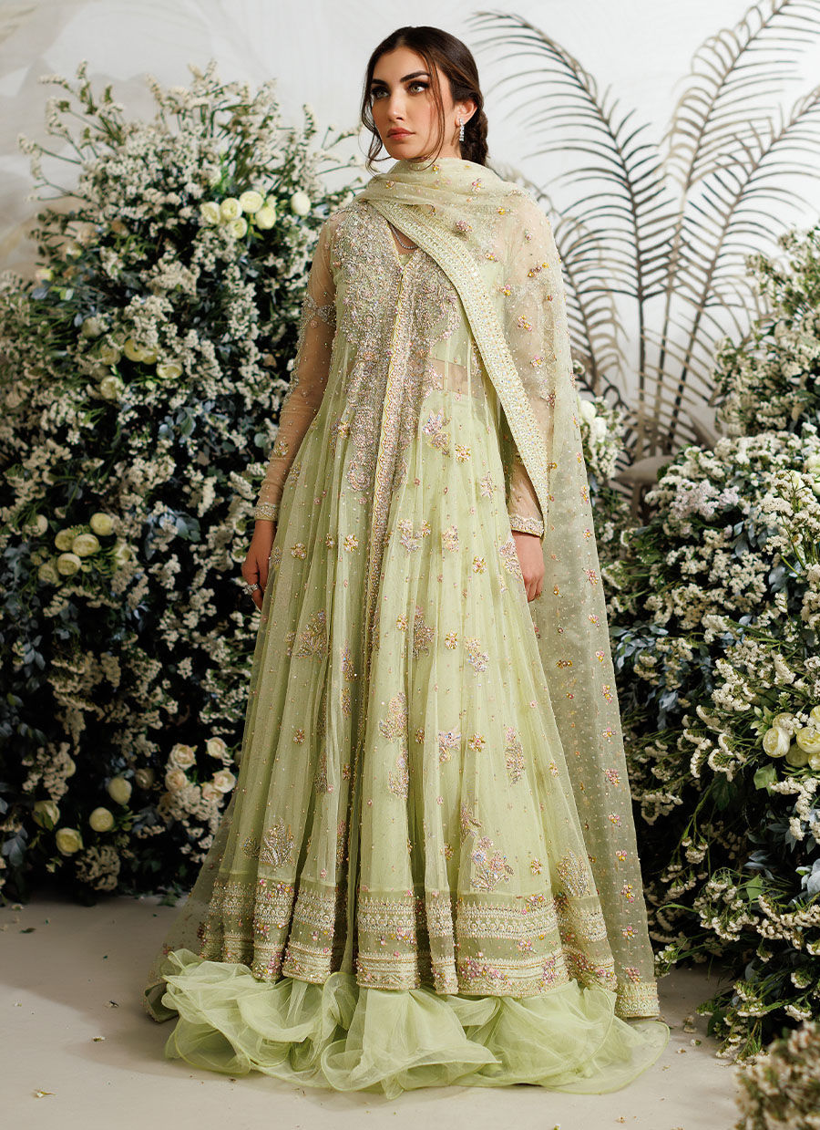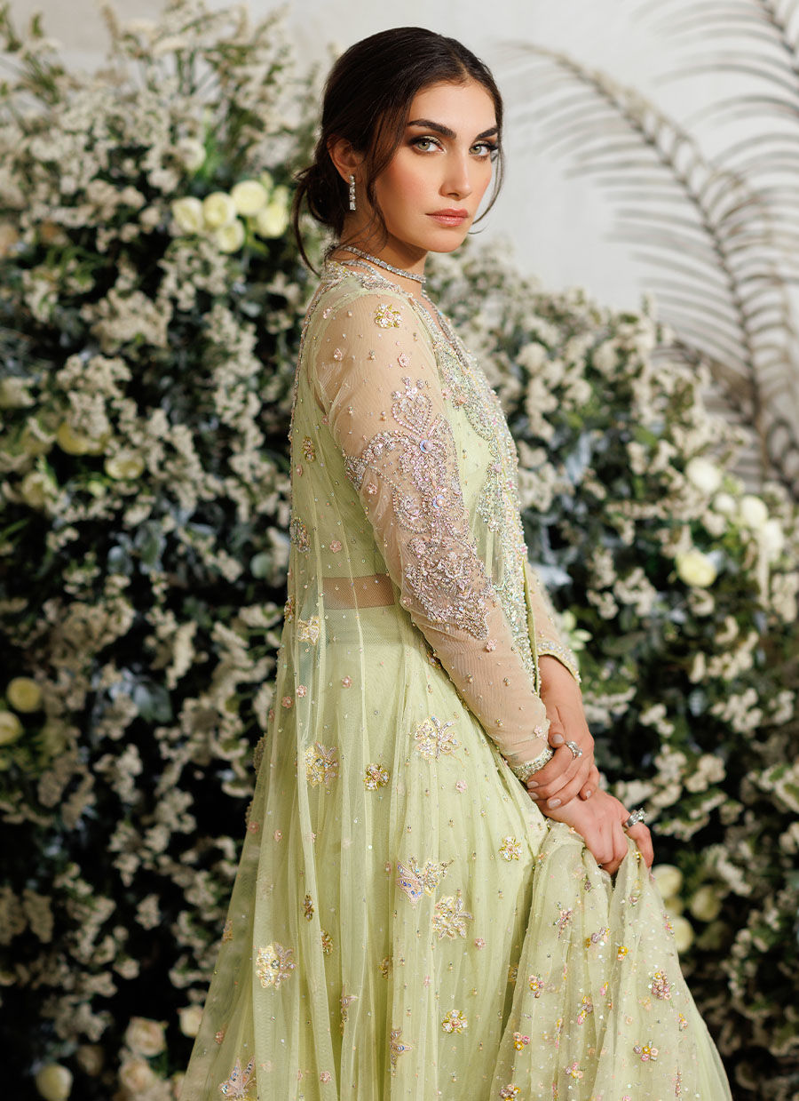 The sheer, kiwi green net kalidaar is layered over a shimmering strappy bustier, also heavily hand worked.