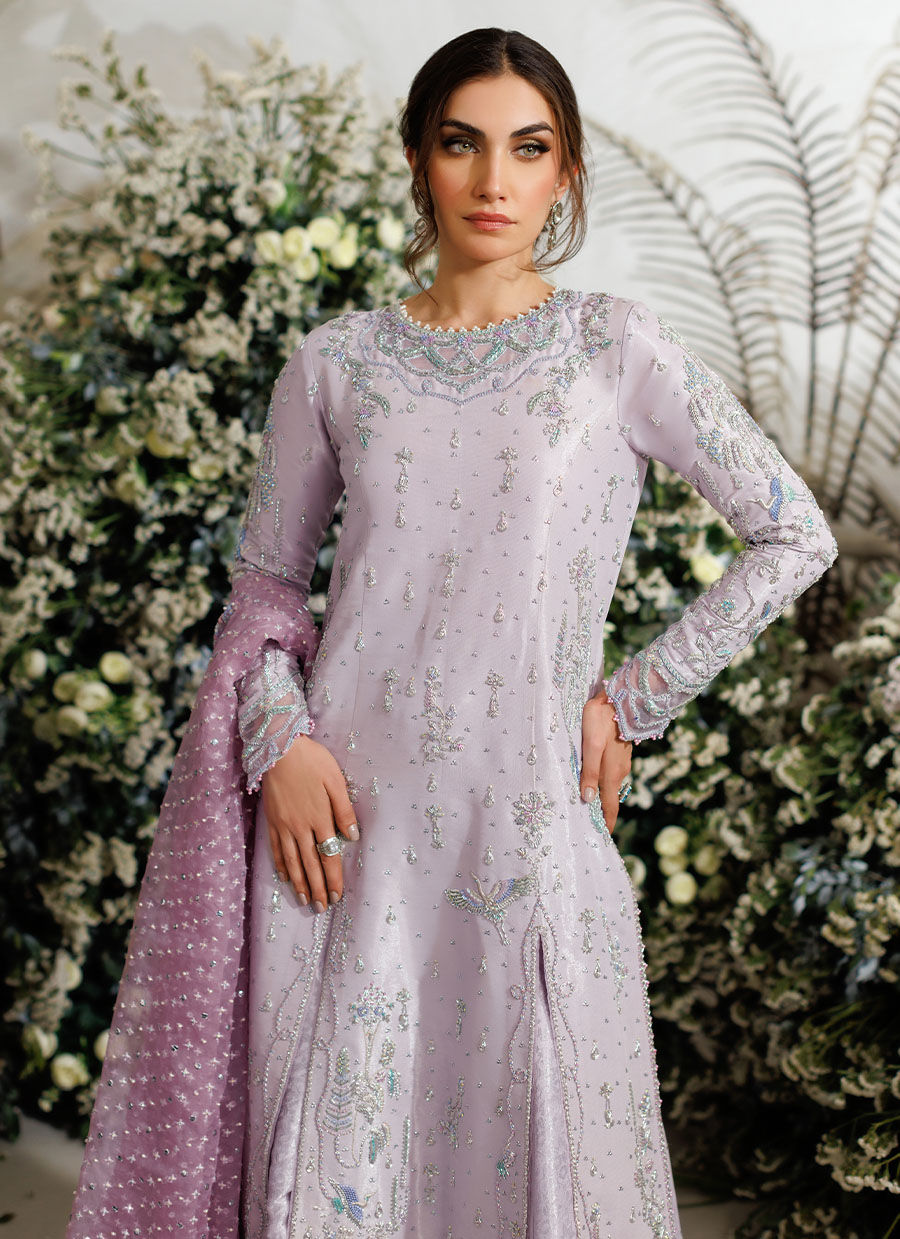 This zari silk kalidaar is in a delicate pale lilac hue which makes it an ideal choice for year around festivities. It has an absolutely gorgeous round neckline, embellished with intricate floral handwork of silver kora, dabka. Delicately hand embellished with sequins and Swarovski crystals to help you shine out amongst the crowd. Intricately hand worked floral motifs along the front of the shirt are designed to have heads turning everywhere.
