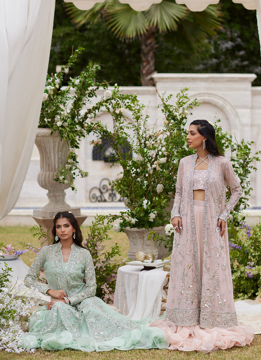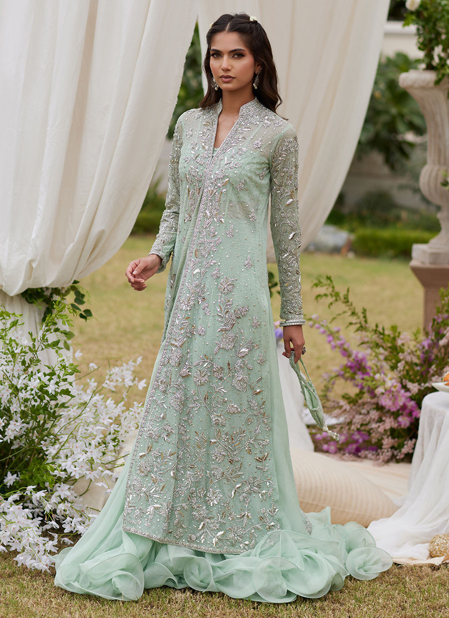 Ethereal and fluid, this pale turquoise ensemble blends delicate detail with dramatic movement. The sheer net jacket shimmers with mukaish, kora, dabka, sequins, and crystals—each embellishment catching the light with subtle brilliance. Beneath, a zari silk bustier blooms softly with tiny silver zardozi flowers, adding quiet intricacy. Completing the look, the 25-yard chiffon, seafoam swirl lehnga billows with effortless volume, creating a silhouette that feels both airy and majestic—a modern statement in timeless craft.