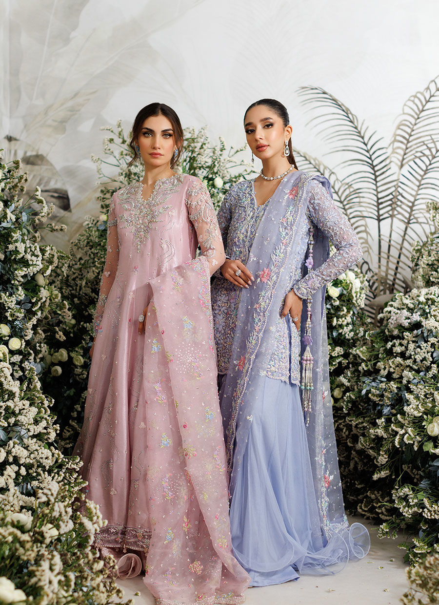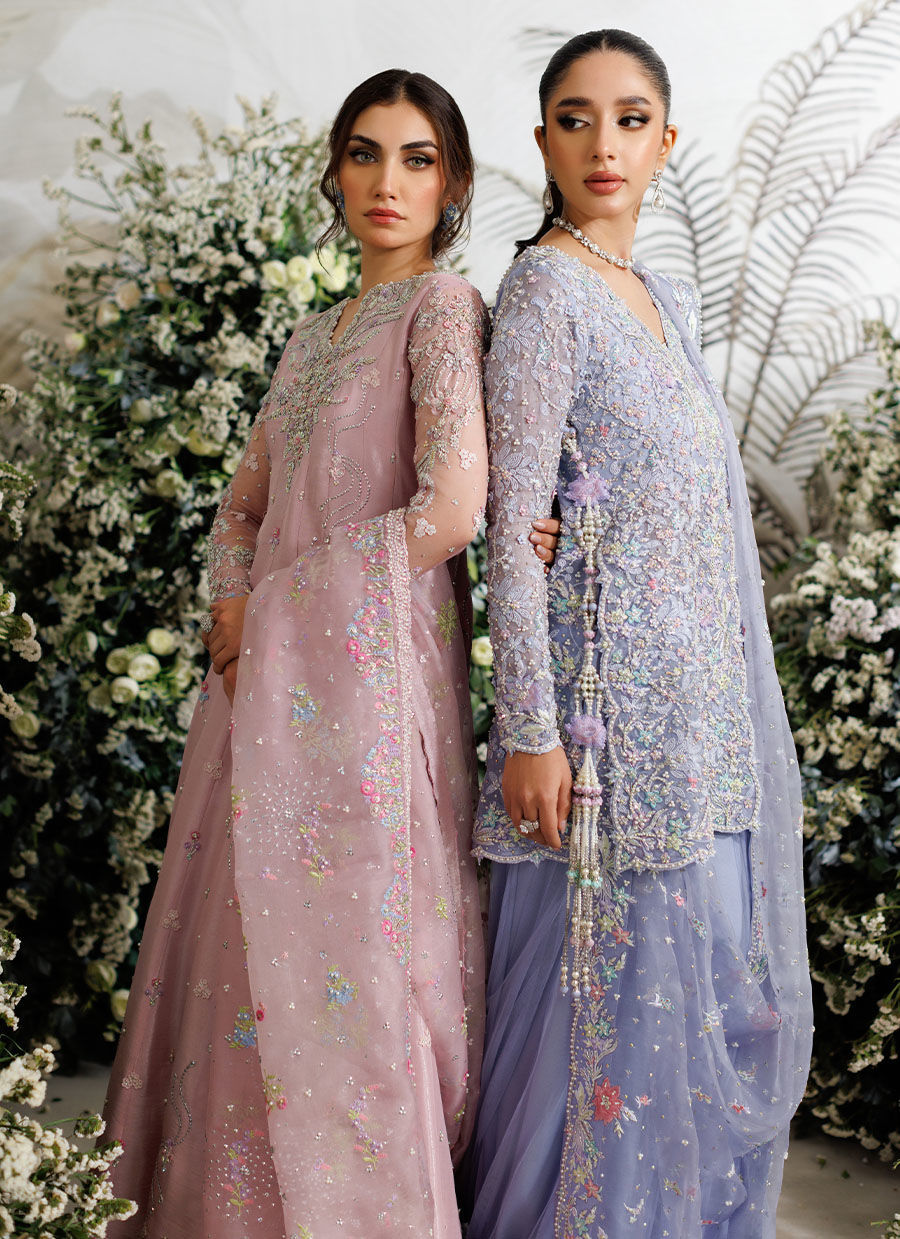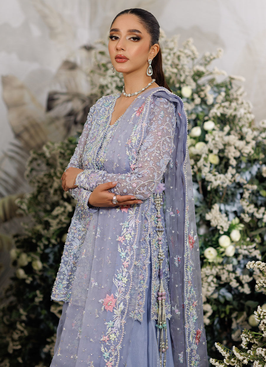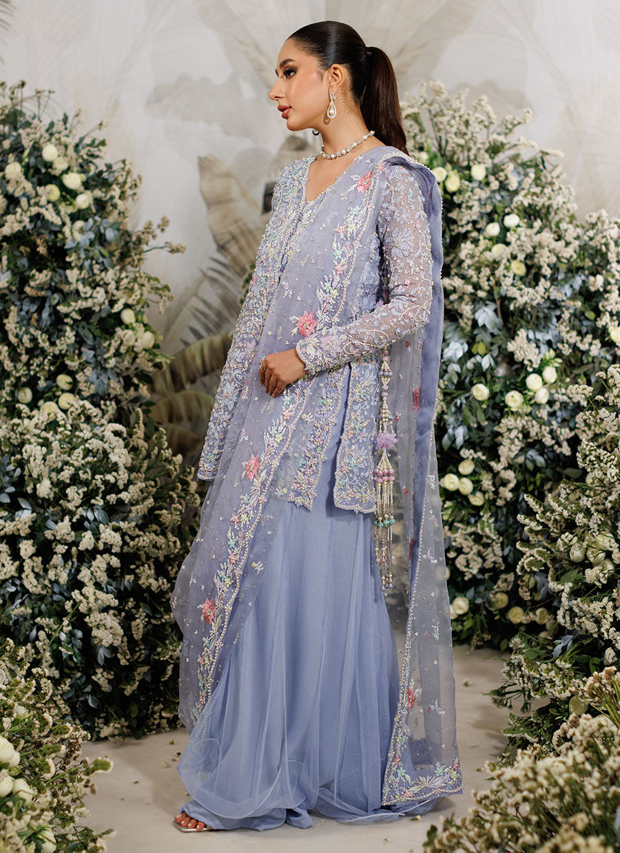 A dramatic jacket cut from pure periwinkle organza, hand embellished with pearls, kora, dabka, Swarovski crystals, pure silk thread work and Swarovski crystals.
