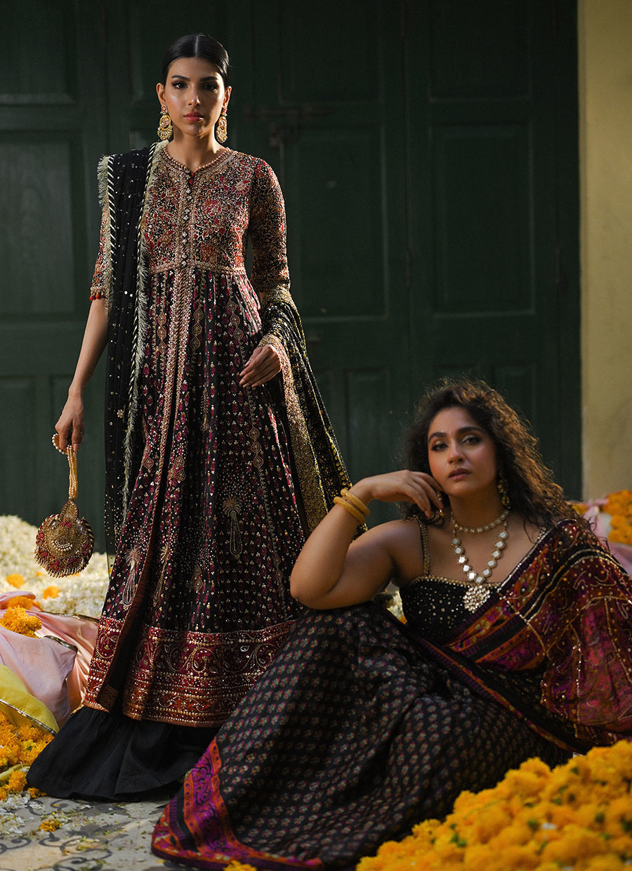 You can never not be the center of attention in this kalidaar. The exquisite ensemble features a hand blocked black and red kalidaar, meticulously adorned with sitara, kora, and dabka handwork, creating a mesmerizing blend of traditional embellishments. The kalidaar is elegantly paired with a raw silk lengha, adding richness and complementing the intricate detailing of the top. The look is complete with a striking black net dupatta embellished with sitara chann all over, imparting a subtle yet radiant shimmer. The dupatta is further adorned with hand worked zari motifs, enhancing its elegance and traditional allure. A golden kiran all around the dupatta adds a touch of luxury and completes the ensemble with finesse. This ensemble is a perfect fusion of classic craftsmanship and contemporary elegance, ideal for making a statement at weddings and festive celebrations. The intricate detailing and harmonious color combination make it a standout choice for those seeking a sophisticated and timeless look.