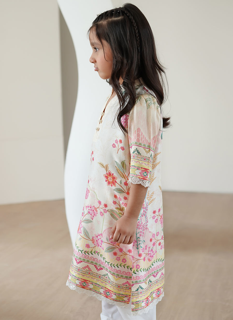 Rendered in pure raw silk and adorned with delicate floral motifs, this straight kurta and shalwar set for young girls captures the essence of youthful grace. Set against a romantic canvas of pale pink, the ensemble radiates warmth and light, evoking a sense of joy and serenity. The kurta features soft pleating that adds gentle movement and a touch of sophistication, while its airy, sleeveless cut ensures comfort and ease. Paired with a matching shalwar, the look is a harmonious blend of classic tradition and contemporary charm. With its subtle sheen and elegant detailing, this set is a timeless choice for festive occasions, perfect for the young girl who delights in understated beauty.