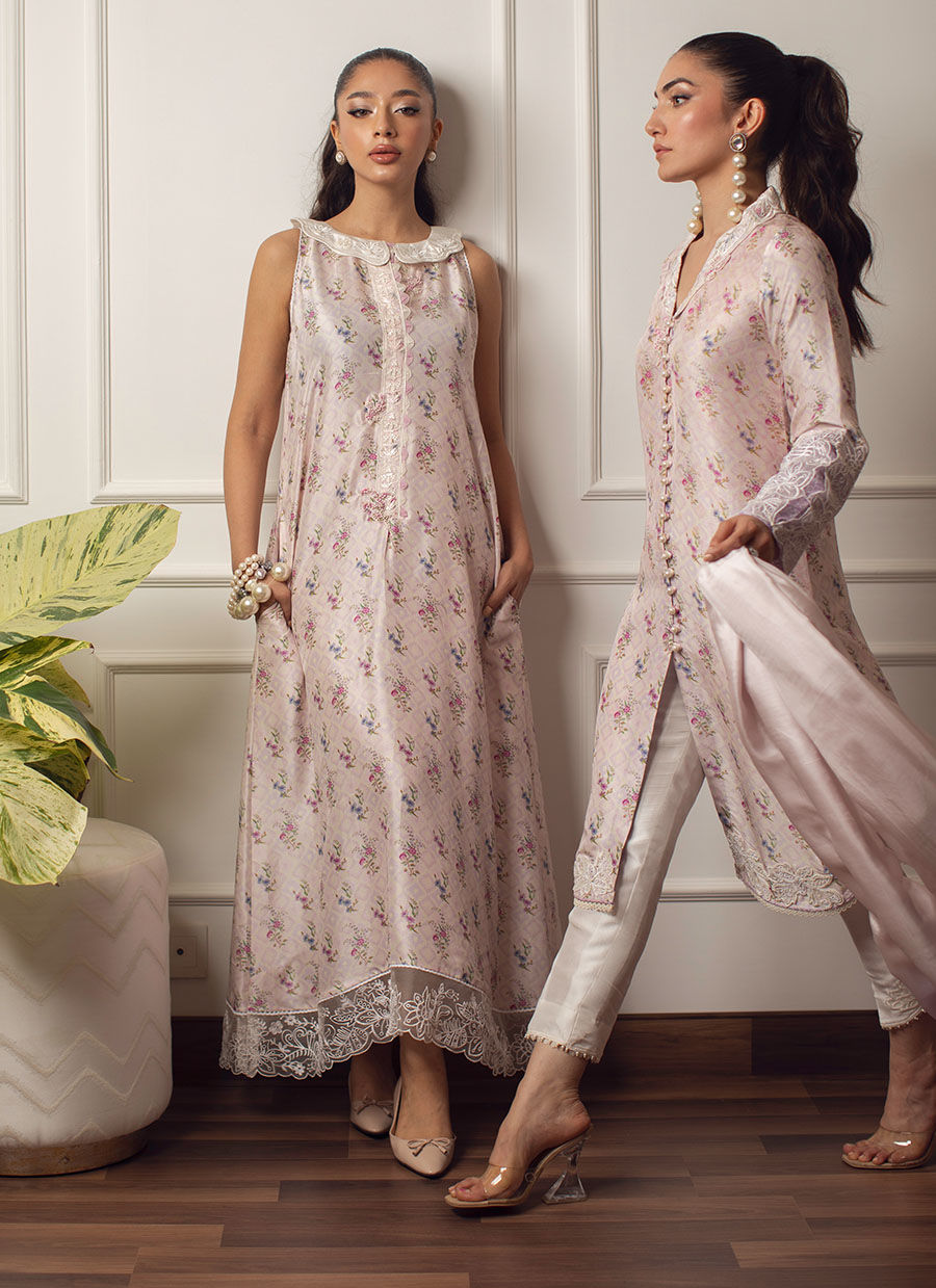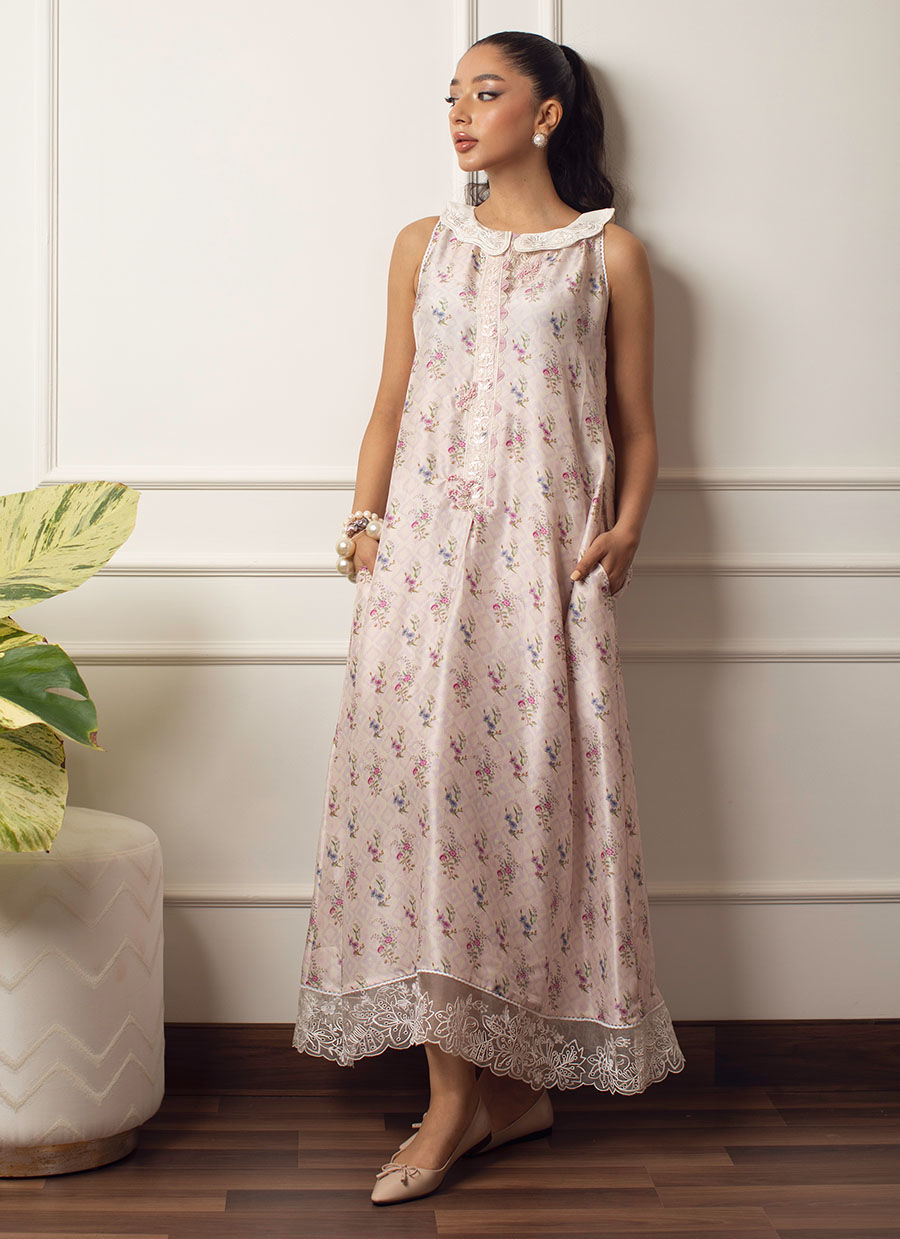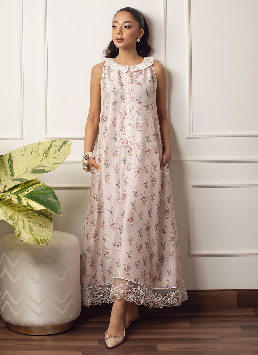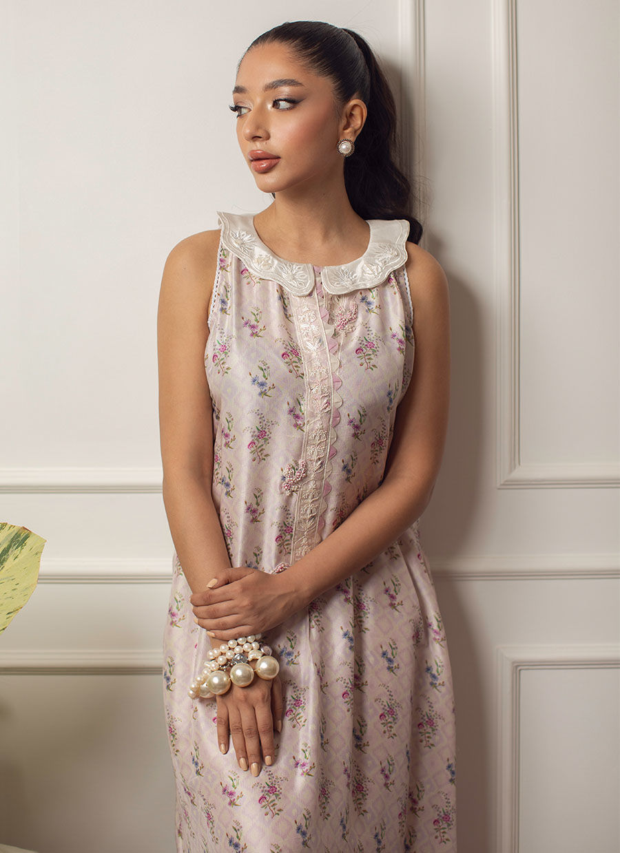 Cut from pure raw silk, Fina Bella is a soothing pale lavender silk, printed with blissfully delicate florals. The ankle length hem is adorned with a delicate lace, while embroidered, scalloped peter pan collar cut from pure silk, gives a fun, playful feel.