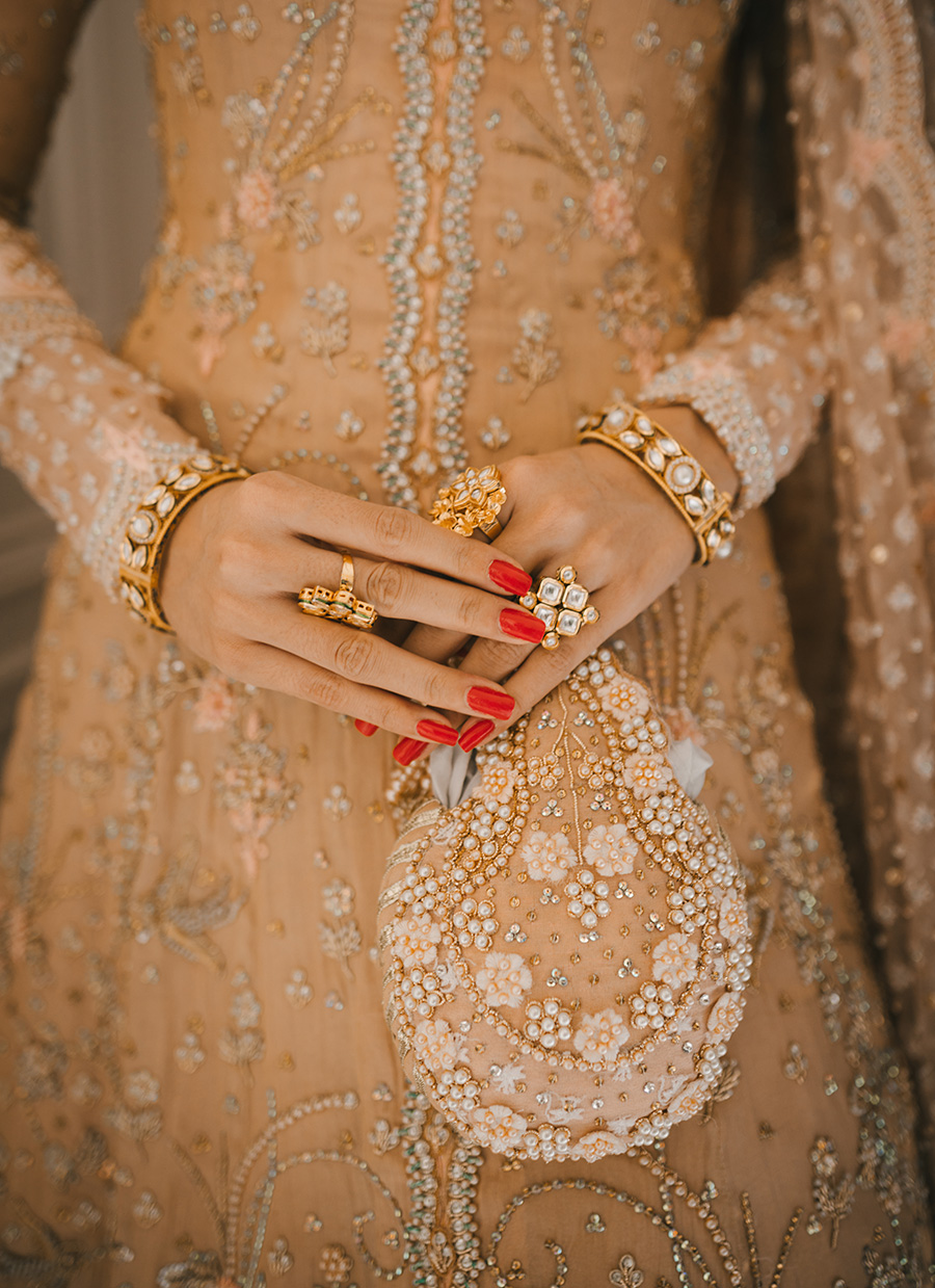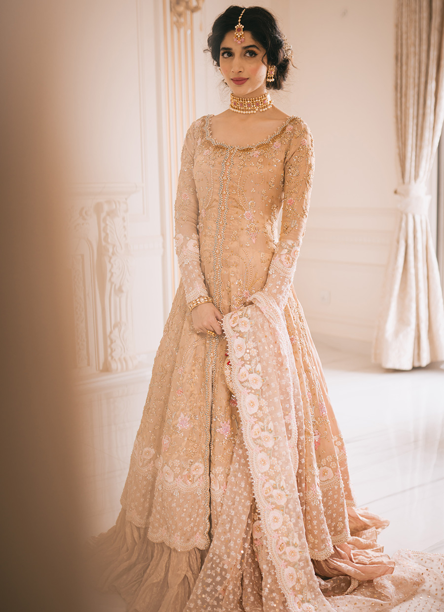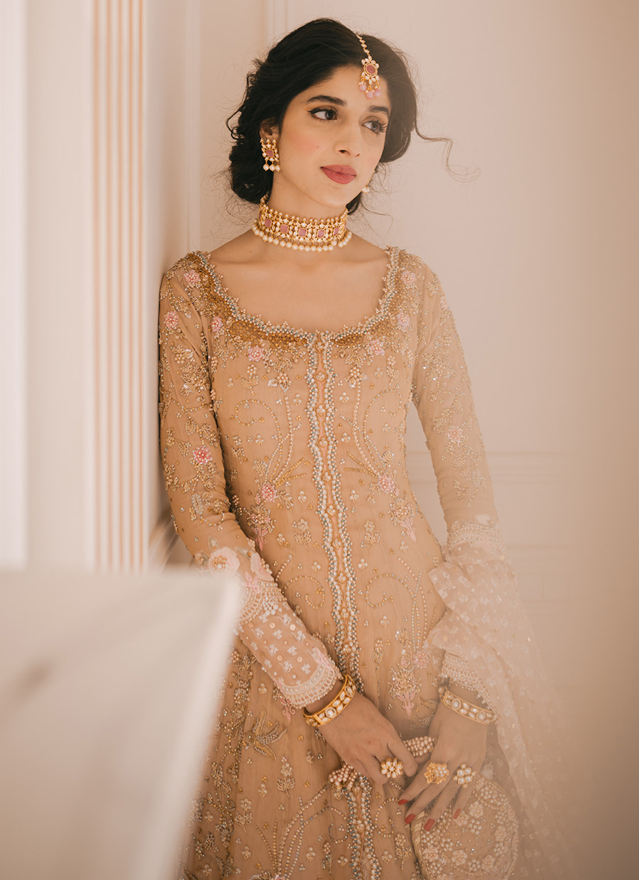 Cascading swathes of rose gold silk, joining to create a flowing kalidaar, laden with meticulously handworked embellishment in glimmering gold. A deliciously sheer pure organza dupatta, delicately hand-embellished with sequins and pearls. For subtly glamorous bride, shimmering in rose gold.