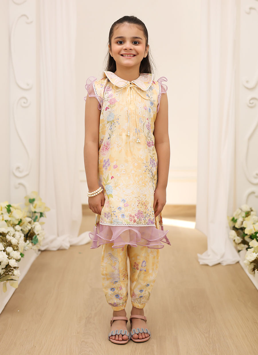 Cut from pure raw silk and patterned with delicate blooms on an uplifting, romantic canvas of pale lemon yellow, this sleeveless pleated kurta and shalwar set for young girls exudes grace and charm. The soft pastel yellow creates a joyful and lighthearted aesthetic, while the floral print adds a timeless touch of elegance. The sleeveless kurta features soft pleats that create beautiful movement and a flattering silhouette, while the airy, relaxed fit ensures comfort and freedom of movement. Paired with a coordinating shalwar, the ensemble offers a perfect balance of tradition and modernity. The rich texture of the raw silk adds a subtle sheen, making it an ideal choice for festive occasions or family gatherings, where your little one can shine with both style and ease.