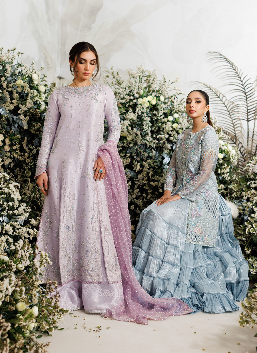 The front open jacket is layered over a crushed, floor length kalidaar in lusciously silvery tissue, this undeniably glamorous ensemble is a sure shot winner for years to come.