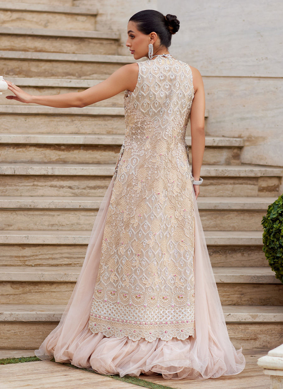 A monochrome moment in a soft sandy hue, this ensemble embodies refined elegance and timeless grace. The long, front-open organza jacket, sleeveless and straight-cut, is adorned with delicate cutwork, further elevated by hand embellishments of pearls, Swarovski crystals, and soft pink resham embroidery, creating layers of subtle romance. Paired with a voluminous pure net lehnga, with a sea foam swirl finish, the look carries graceful movement and ethereal charm. The ensemble is completed with an intricately hand-worked choli, shimmering in silver, adding a statement note of sophistication. A vision of understated luxury, this creation celebrates the power of tonal harmony — classic, graceful, and eternally modern