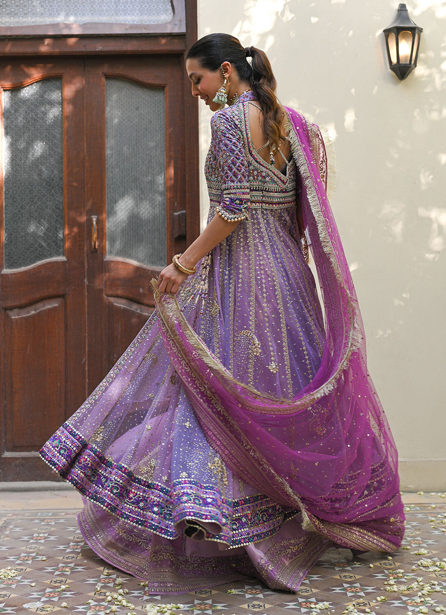 A breath of fresh air, the Hadria kalidaar is unlinke any kalidaar before. A captivating lavender hand-blocked front-open kalidar, adorned with intricate handwork that enhances its elegance. The kalidar includes kalis in multiple shades of purple, enriched with gota work and sitara chann all over, creating a shimmering and textured effect. The kalidaar is paired with a lavender zari fabric lehenga, finished with a complementary zari border that adds a touch of regal charm and completes the ensemble's cohesive look. Completing the outfit is a purple net dupatta embellished with sitara chann all over, enhancing its ethereal beauty. The dupatta is adorned with a handworked border on all sides, showcasing traditional craftsmanship and adding a graceful finishing touch. A gold kiran edging adds a touch of luxury and ties the ensemble together seamlessly. This ensemble is perfect for special occasions where you want to exude grace and sophistication.