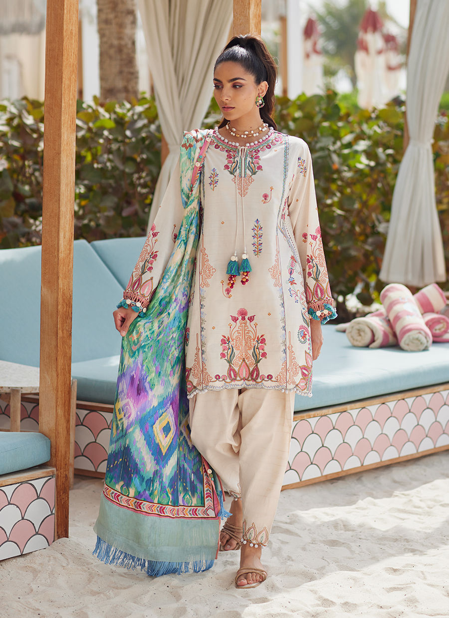Irene Ivory is the one your wardrobe is waiting for! A canvas of pristine ivory is lavishly adorned with striking embroidery in rich, eye-catching hues. The sumptuous PURE mediun silk dupatta is emblazoned with a stunning print in bright bold hues, making this the perfect transitional piece to carry you from day to dusk with timeless, easy elegance. Irene Ivory - tailor made to elevate your everyday.