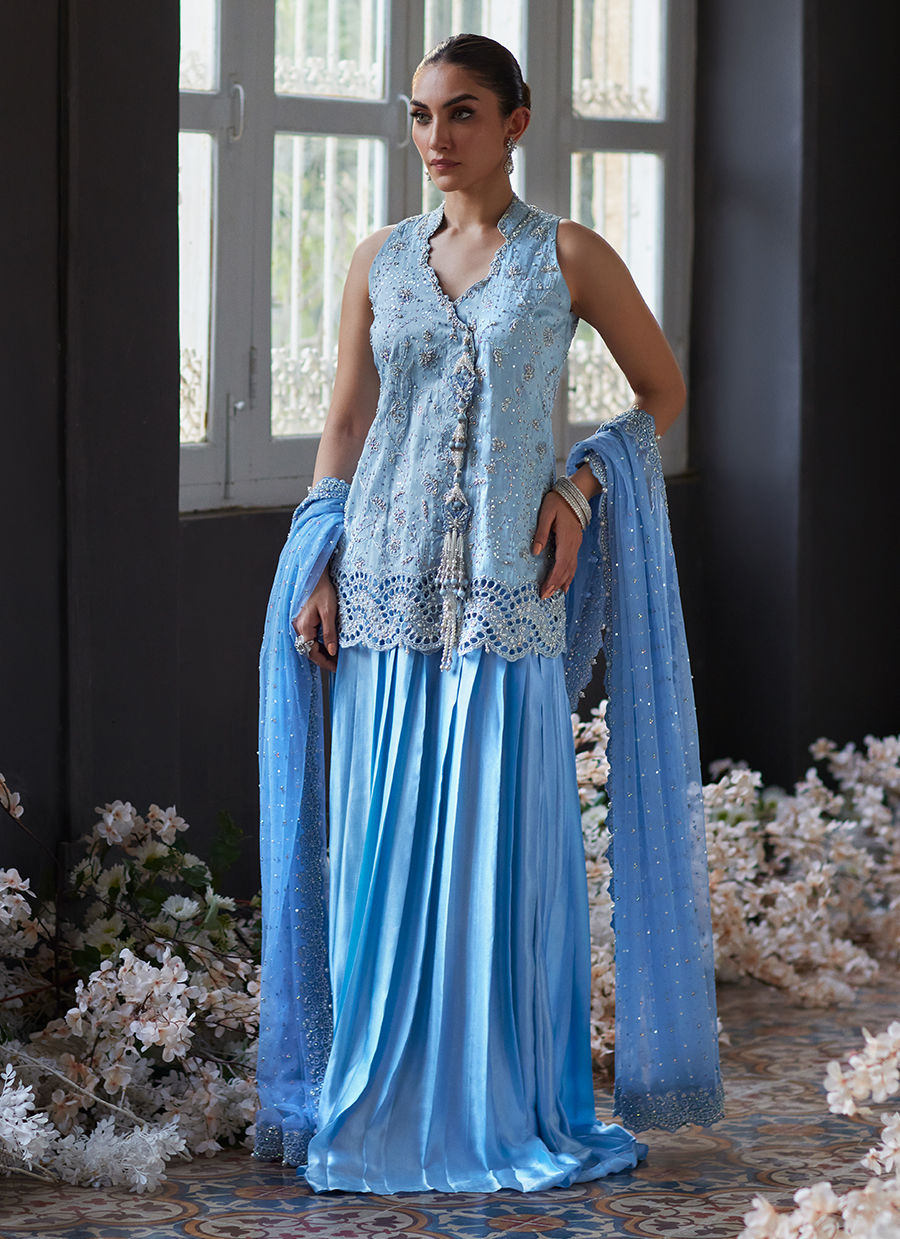 Color: Sky Blue Fabric: Shirt: Zari, Pants: Pure Jamawar and Dupatta: Pure Tulle Work Details: Embroidered and Embellished