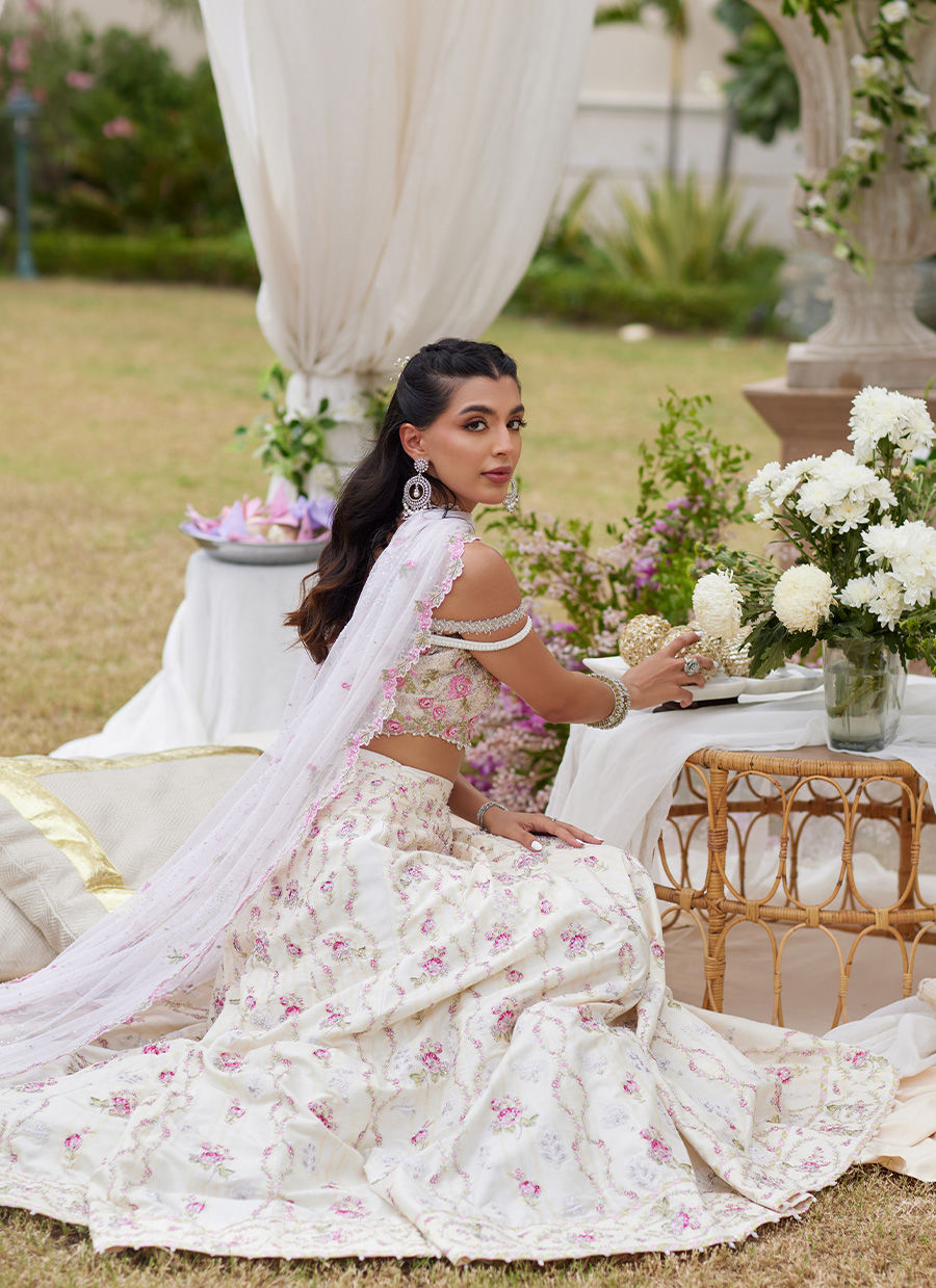 Sleek in ivory, this look redefines bridal elegance with a bold contemporary lens. A printed lehnga touched with zardozi detailing pairs effortlessly with a sharply cut silk bodice, densely worked with resham ari florals and cutdana for structured shimmer. The net dupatta, finished with resham borders and scattered Swarovski highlights, adds just the right balance of delicacy. A statement in modern refinement, it’s bridal wear that feels as effortless as it is unforgettable.