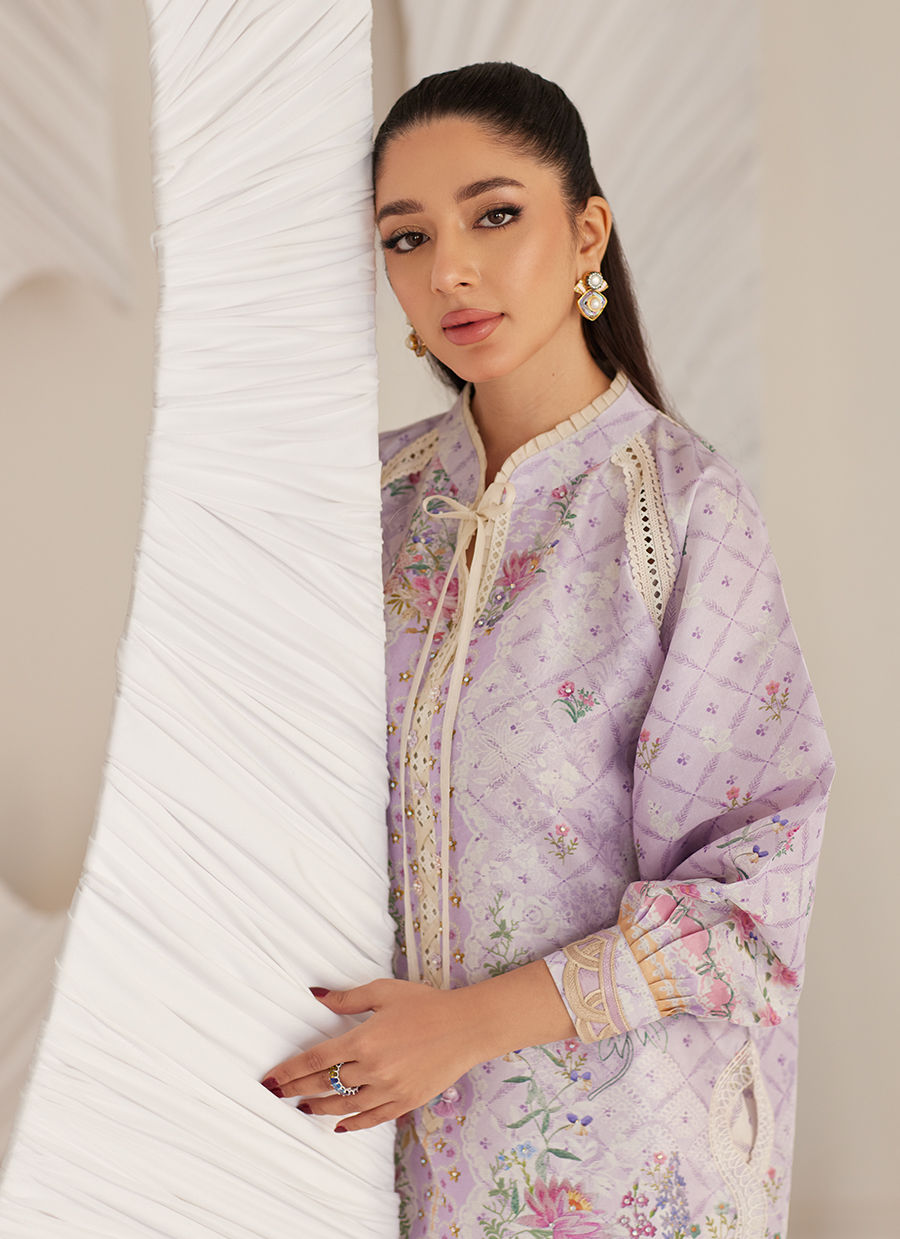 A canvas of soft lavender raw silk, is printed with delicate florals. The romantic, forever flattering silhouette has an elegant neckline, adorned with delicate hand-made floral motifs, pearls, sequins and unmissable organza detailing. The voluminous statement sleeves add to the magical, whimsical feel of the shirt.