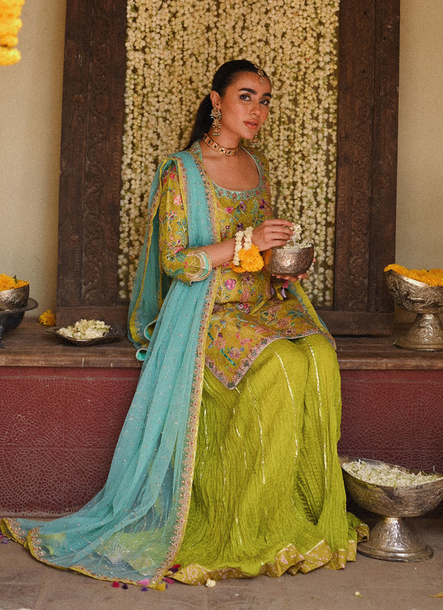 The epitome of a fun and festive outfit, Kisa features a myriad of colors on a kiwi textured zari silk. Adorned with delicate floral embroideries, playful birds, and intricate gota motifs. The zardozi, ari, and thread work, along with raw silk appliques, enhances the design and adds a timeless festive element to the ensemble. The outfit is paired with crushed pure silk Dhaka, finished with a block printed border and gota accents. The look is complete with an embellished ferozi net dupatta, highlighted by embroidery and hand worked borders all around and colorful tassel finishing’s on the corners, adding a playful yet elegant touch.