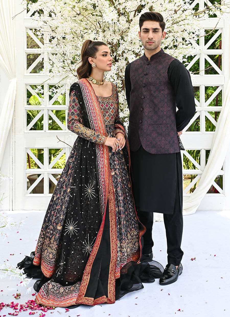 Farah Talib Aziz’s foray into menswear results in a sleek, pared down approach to the traditional festive ensembles for men. The black cotton silk kurta pajama serves as the foundational element of the outfit. Its black color exudes elegance and simplicity, while the cotton silk blend ensures comfort and a slight sheen that adds to the overall aesthetic. The maroon and black printed chunri raw silk waistcoat is the statement piece that adds character and flair to the ensemble.