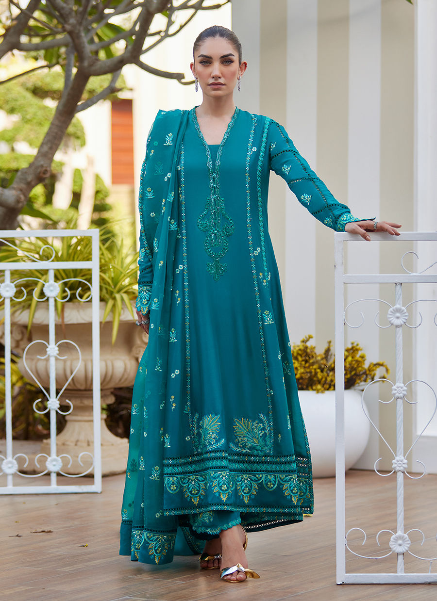 Turn heads this season in an emerald green masterpiece made to mesmerize. This five-paneled raw silk shirt is a true statement piece, intricately embroidered with fantastical botanical motifs that feel both bold and ethereal. The forever flattering neckline is adorned with vivid, hand embellishments. Shimmering sequins and cut dana details add just the right amount of sparkle, making the ensemble perfect for both day and evening festivities. Completing the outfit is a coordinating emerald organza dupatta, trimmed with a four-sided floral embroidered border for a touch of soft elegance. Pair yours with the pure raw silk izaar (as pictured) and statement earrings to create a look that’s nothing short of unforgettable.