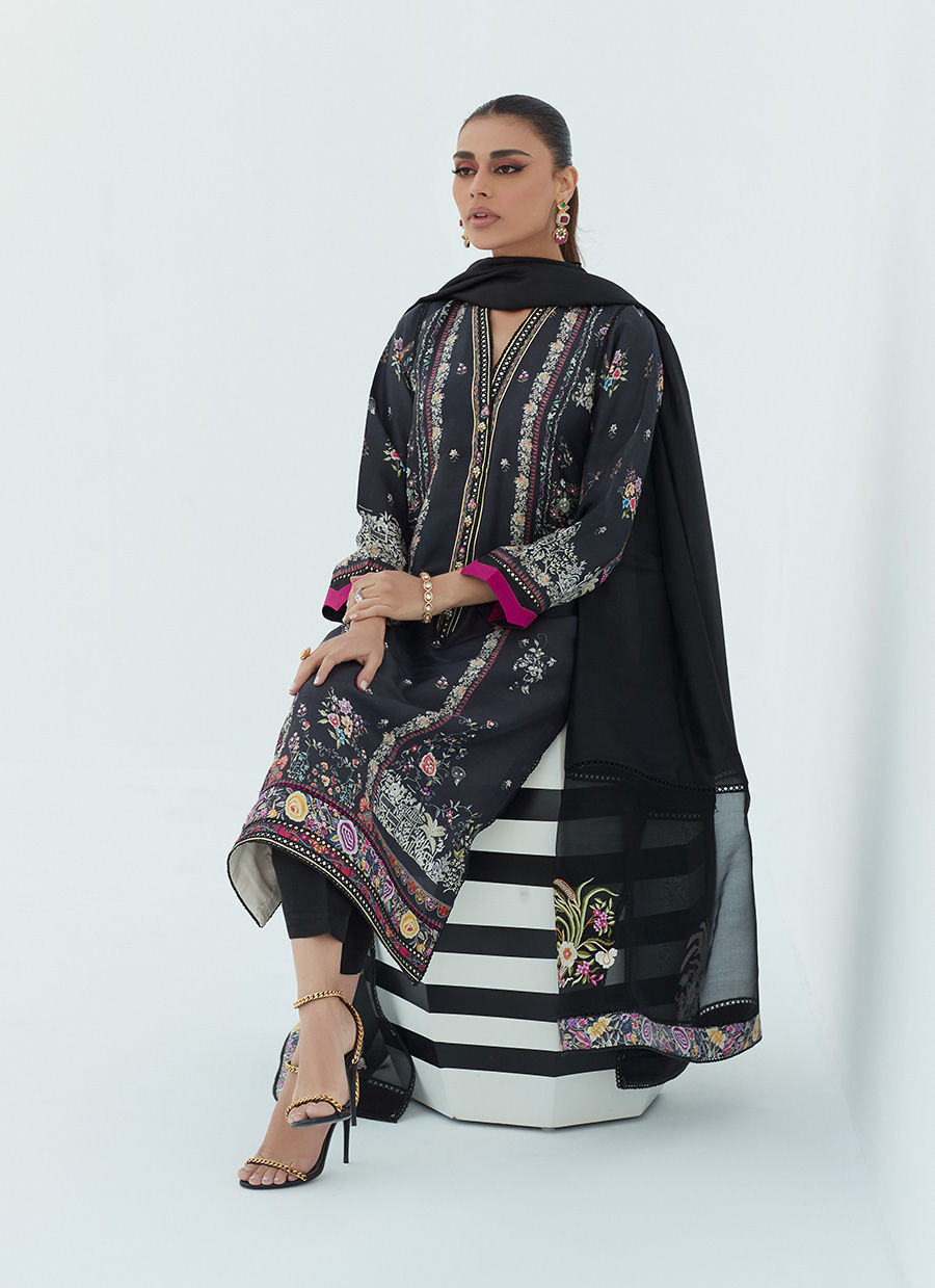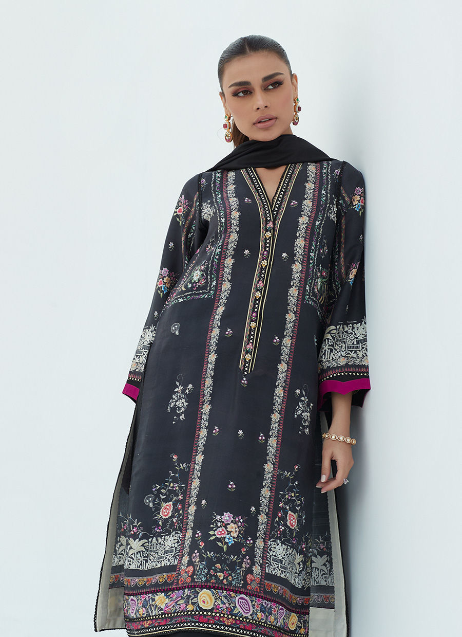 The elegant, straight shirt is paired with a pure medium silk dupatta in coordinating black trimmed with organza borders embroidered with vibrant blooms.