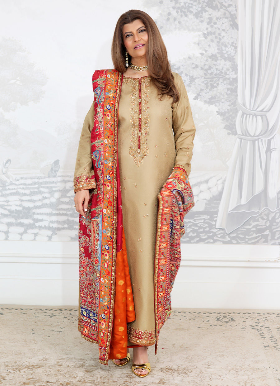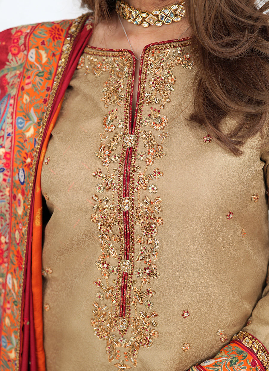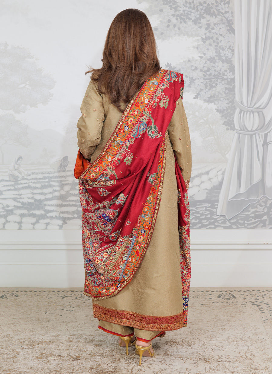 An exquisite ensemble in a soft sandstone beige, adorned with delicate hand embellishments. The kurta features subtle embroidery along the neckline, sleeves, and daaman, creating a refined yet festive charm. The look is elevated with a richly detailed multicolored chaadar, showcasing intricate patterns in shades of crimson, orange, and blue. Finished with a beautifully worked border, the dupatta adds vibrance and depth to the neutral kurta. This timeless design blends tradition with elegance, making it a versatile choice for festive gatherings and formal occasions.