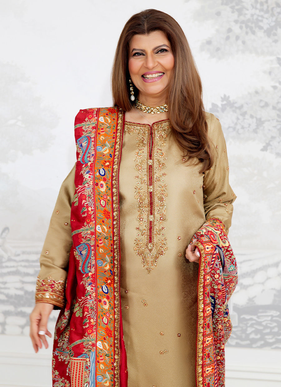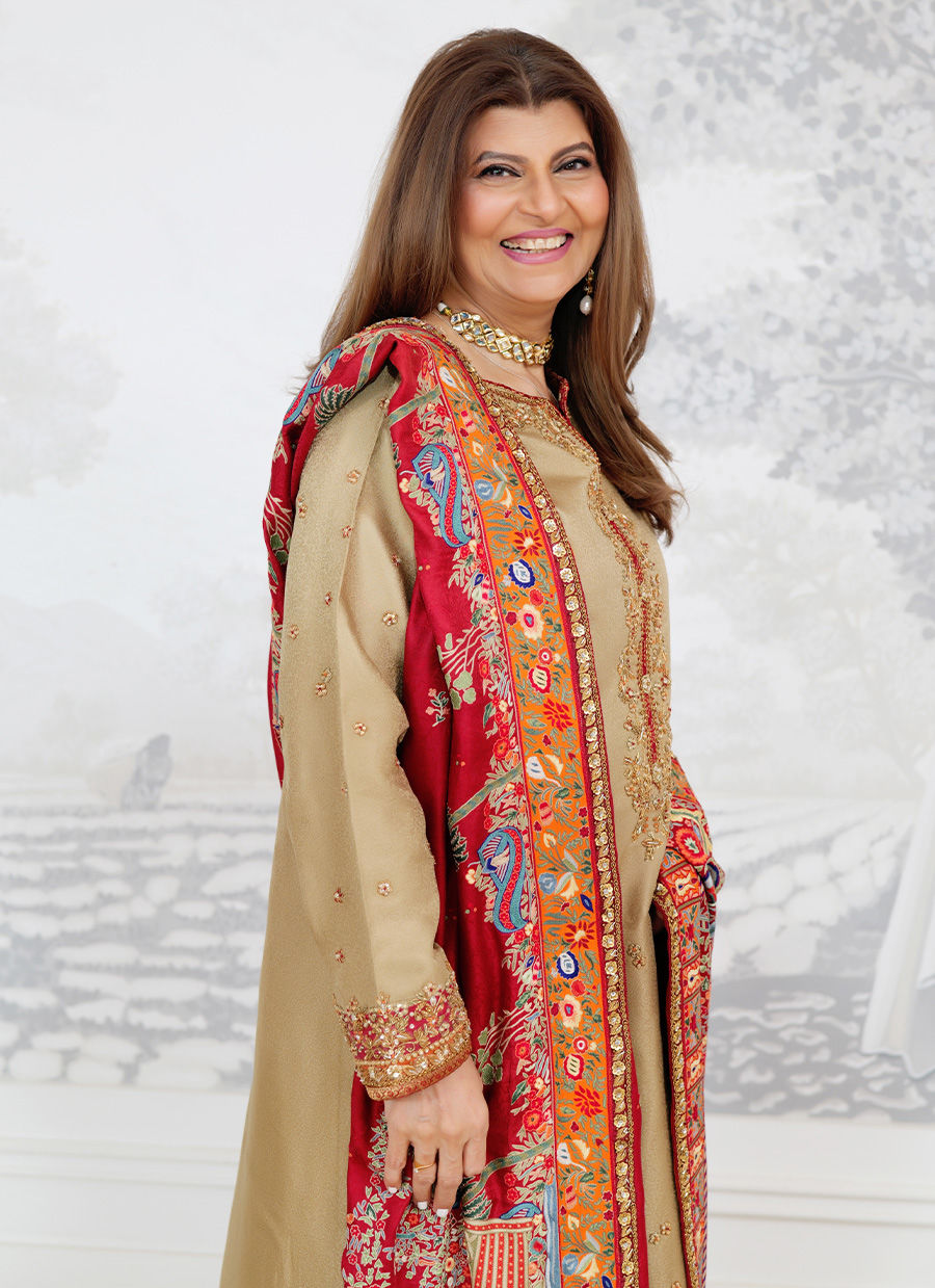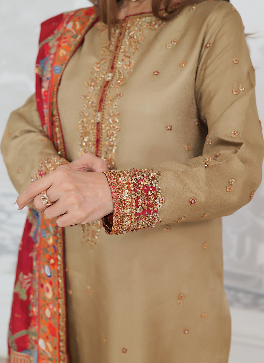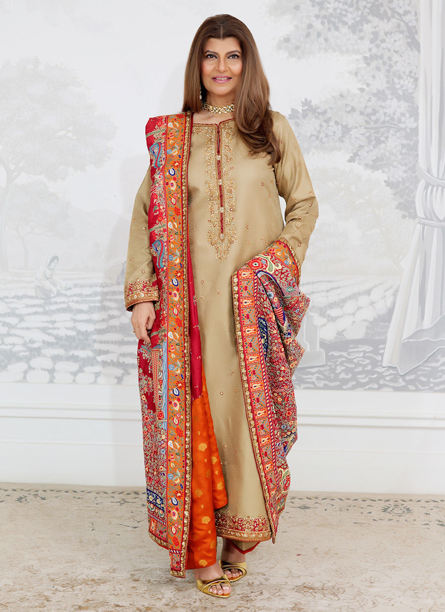 An exquisite ensemble in a soft sandstone beige, adorned with delicate hand embellishments. The kurta features subtle embroidery along the neckline, sleeves, and daaman, creating a refined yet festive charm. The look is elevated with a richly detailed multicolored chaadar, showcasing intricate patterns in shades of crimson, orange, and blue. Finished with a beautifully worked border, the dupatta adds vibrance and depth to the neutral kurta. This timeless design blends tradition with elegance, making it a versatile choice for festive gatherings and formal occasions.