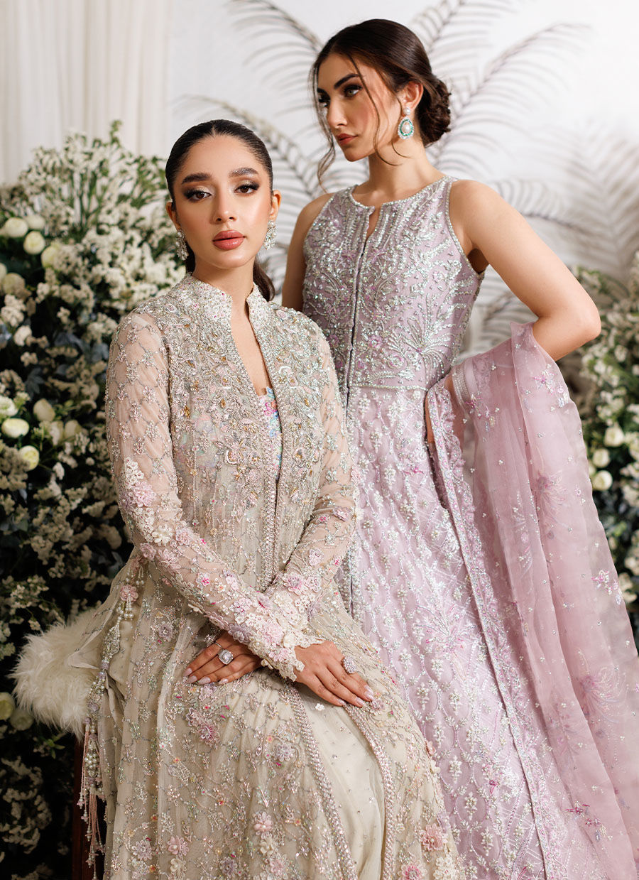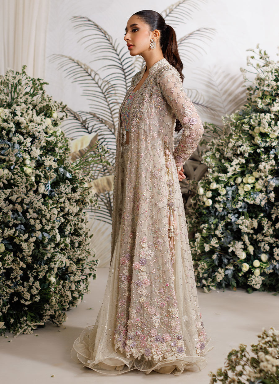 Cut in pure net in a soft shade of ivory our kalidaar jacket is what dreams are made of. The Jacket itself features the most ethereal 3-D floral hand work that's further accentuated with Swarovski crystals, sequins, pearls, zardozi and hand-made organza petals. The embellishments forma trellis that features florals in a myriad of lavender, pink and mint shades featuring ombre techniques that make this outfit a true piece of art. The outfit adorned in with silver zardozi, resham work with pearl sequins and crystal details sings in symphony with our celebrated multi layered net skirt featuring dramatic ruffles and floral springs on the border. The bodice features a geometric appliqués of soft pastel shades with hand embellishments that boast immaculate attention to details. A particularly loved feature of this outfit is its handmade tassels that flow down the back and sides.