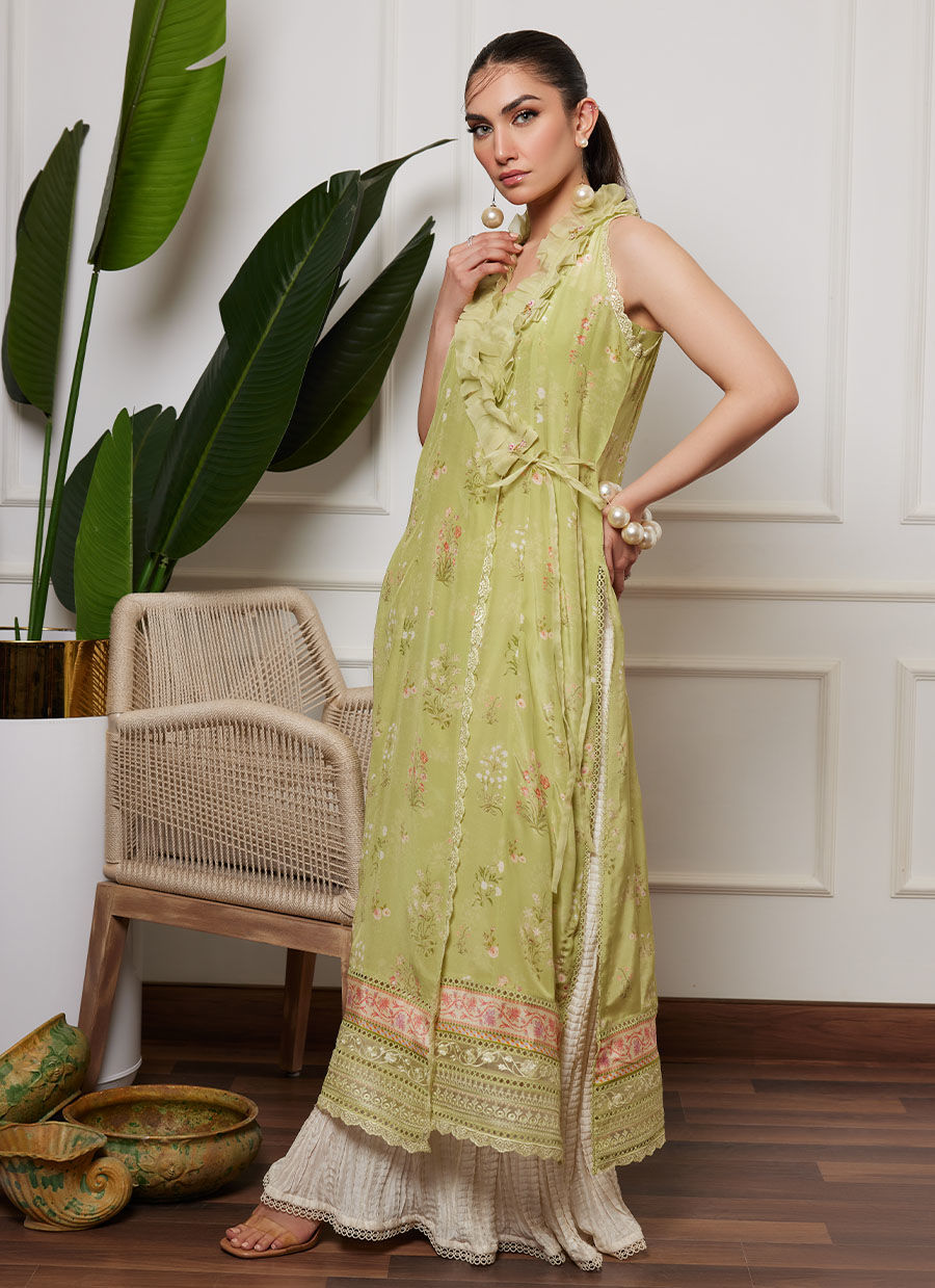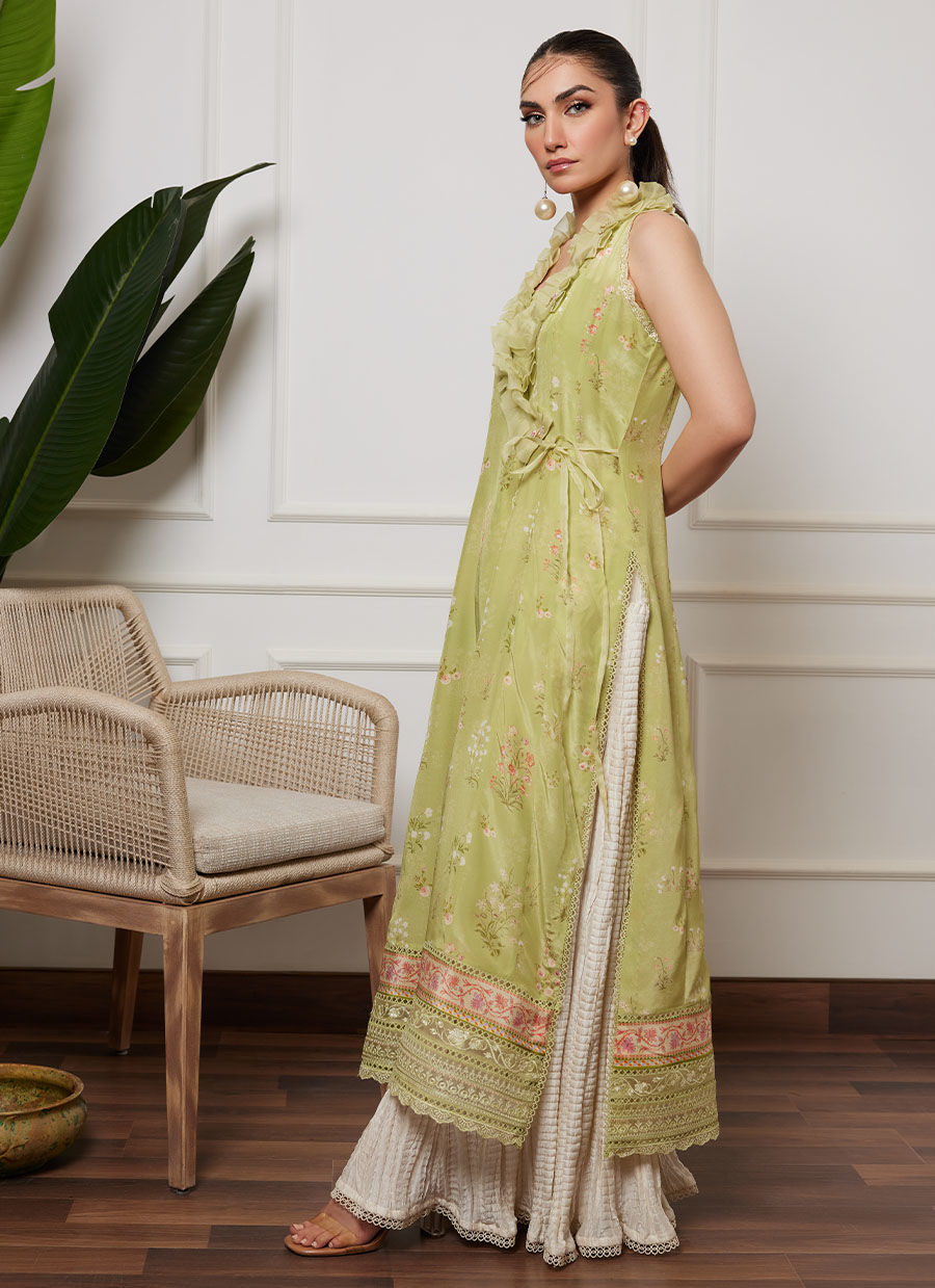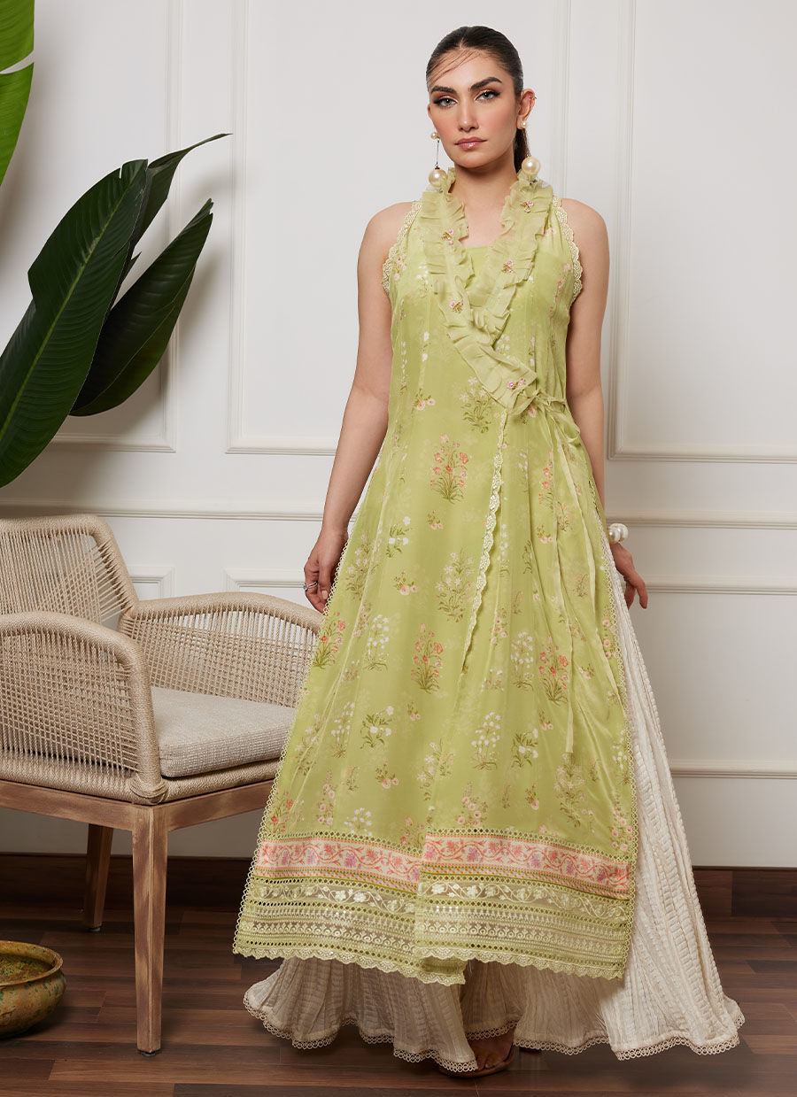 Discover elevated, refined prints created in-house with immaculate tailoring and steal the show this festive season! Tinged with the signature FTA whimsy and romance, this ensemble is impossible to resist! A canvas of refreshing kiwi green crepe silk, is printed with uplifting florals in ivory and eye-catching shades of pastel pink and purple.