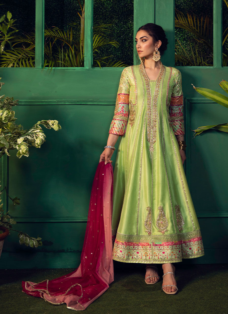 The rounded v neckline, printed elbow length sleeves and bodice are lavishly handworked with glimmering gold gota, nakshi, sequins and dabka. The kalis cascade down from the heavily worked bodice adding graceful movement and that unforgettable drama.