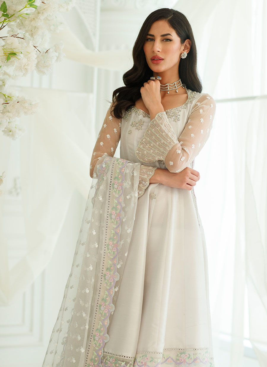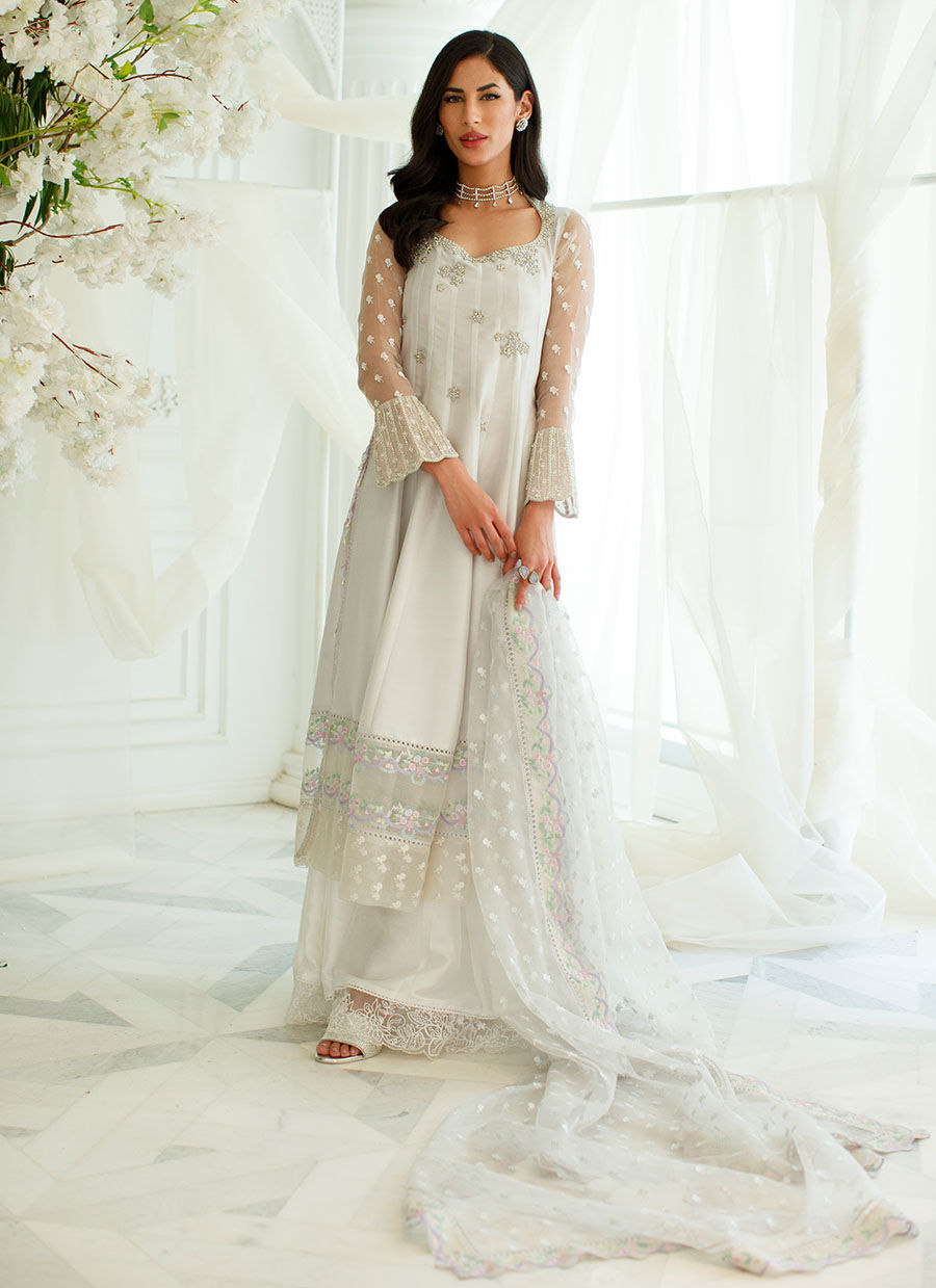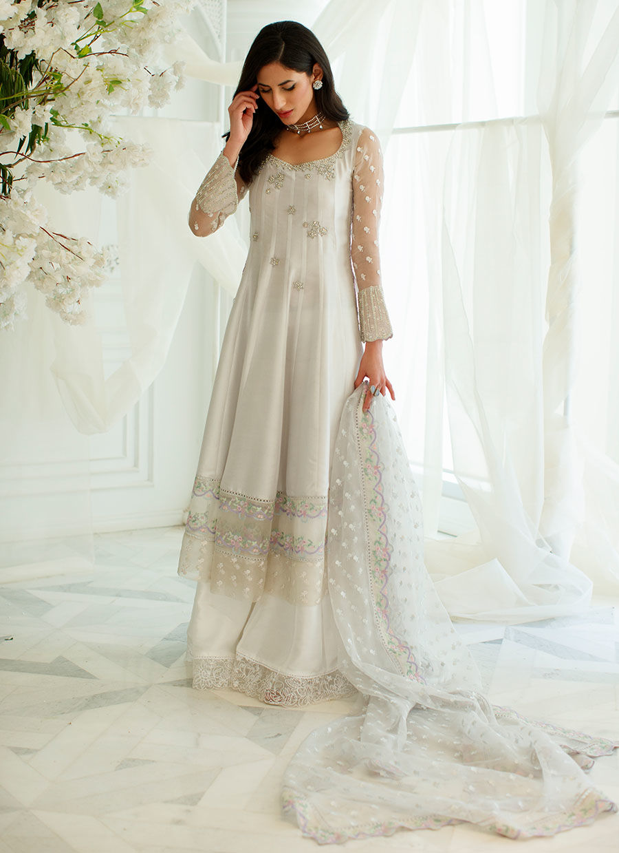 Nothing captures FTA’s feminine, romantic aesthetic more than a lovely, effortlessly flowing kalidaar. Cut from pure silk, this gorgeous ensemble, in a striking silvery hue, is going to be your perfect solution for all special occasions.