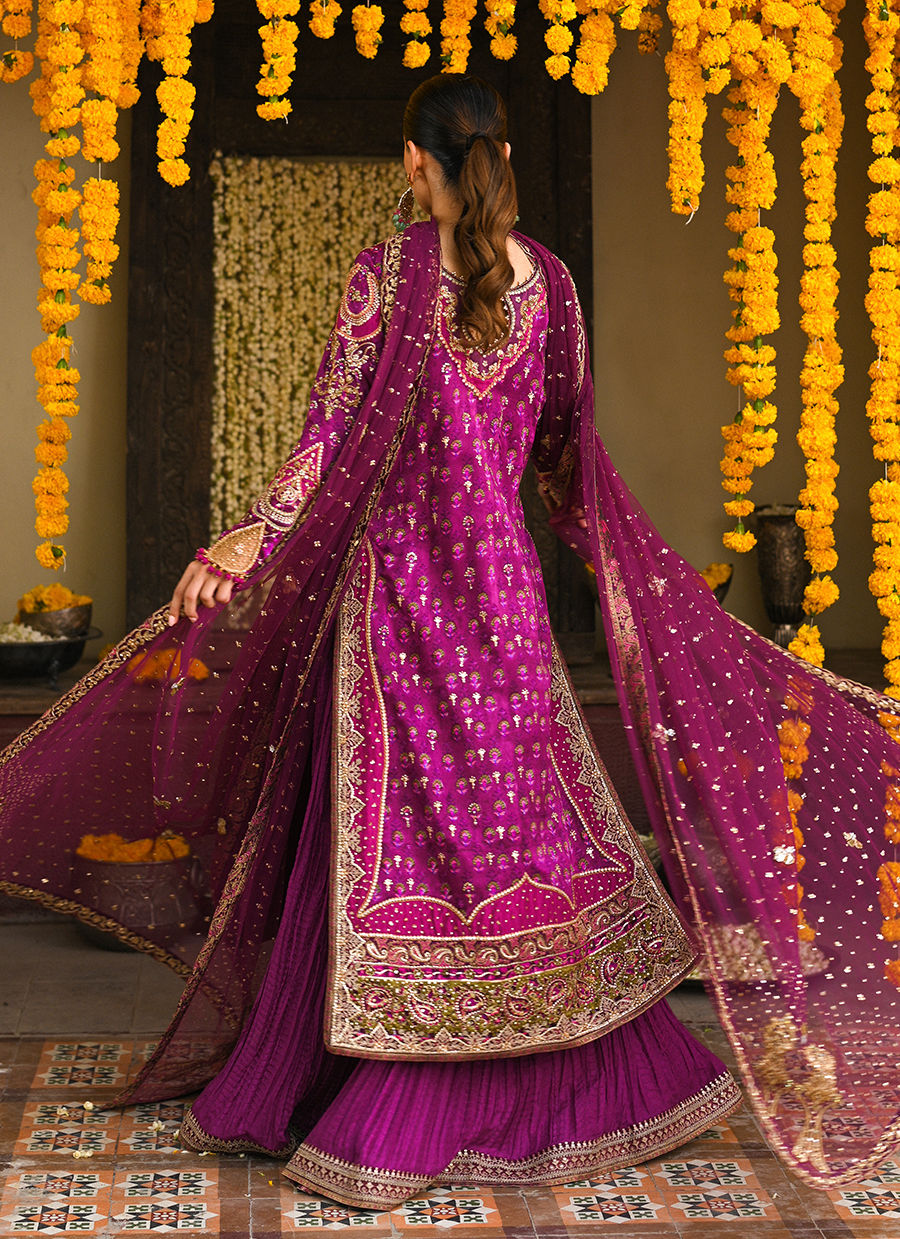 An uber flattering silhouette that gives sleek length to your look. A stunning hand blocked magenta kurta embellished with pink appliques and intricate handwork including kora, dabka, and sitara. This combination creates a rich and textured surface, adding depth and elegance to the outfit. Paired with the kurta is a crushed medium silk magenta dhaka, providing a luxurious and flowing complement to the top. The Dhaka pants is finished with a zari border, enhancing its regal appearance and harmonizing with the kurta. Completing the ensemble is a magenta net dupatta, intricately adorned with sitara chann all over, which lends a subtle sparkle. The dupatta is further embellished with a hand worked border all around, adding a touch of craftsmanship and sophistication. Delicate zari motifs on the corners of the dupatta add a finishing flourish, enhancing its overall beauty. This ensemble is perfect for festive occasions, blending traditional craftsmanship with contemporary design elements to create a sophisticated and captivating look.