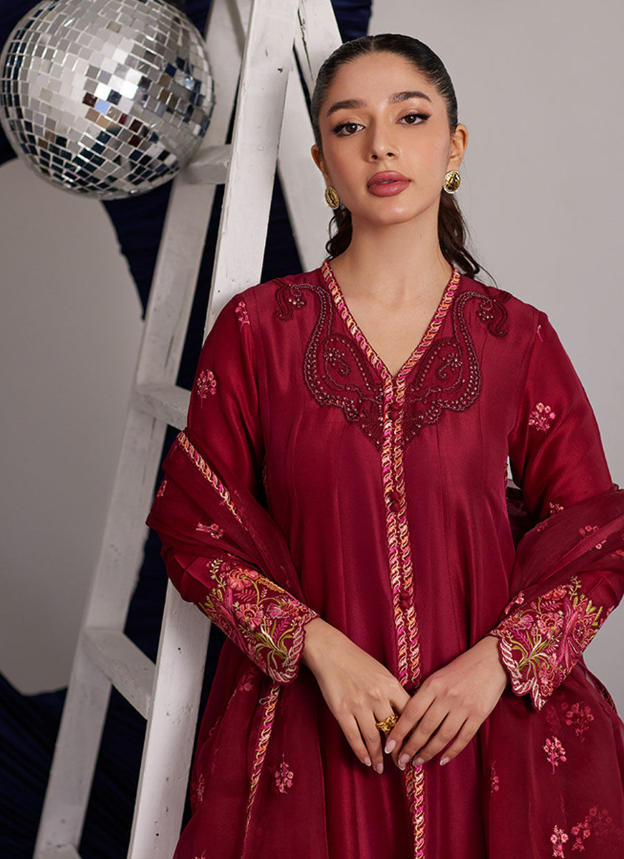 Color: Crimson Fabric: Raw Silk Work Details: Embellished And Embroidered