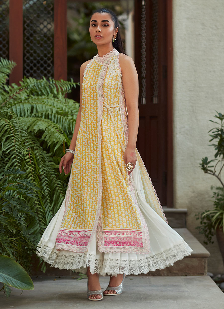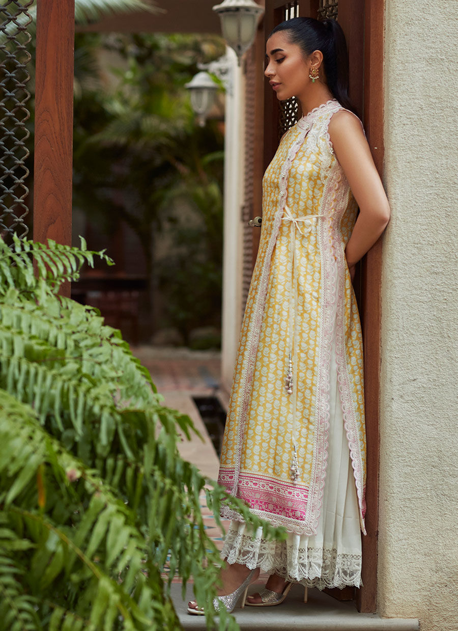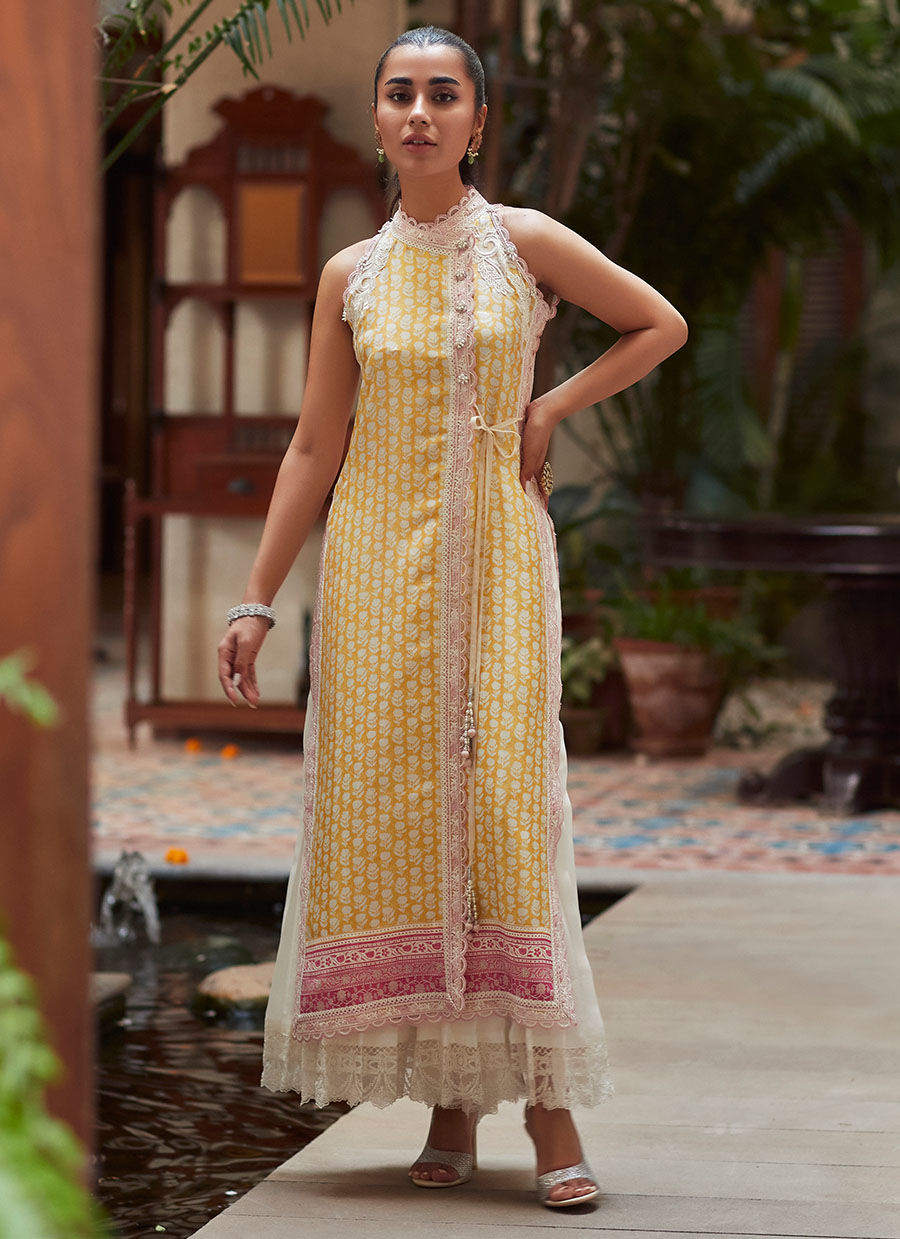 Cut from pure raw silk patterned with blooms in a lovely refreshing palette of lemon yellow and ivory, with sea-shell pink borders.