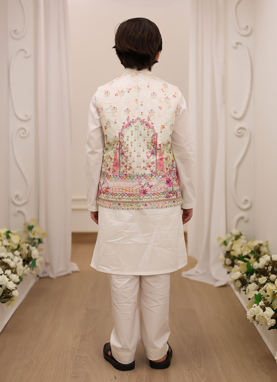 Cut from sumptuous raw silk, the waistcoat is printed with whimsical florals that bloom daintily all over the waistcoat, making this an absolute must-have. The graceful, relaxed-fit waistcoat is paired with a plain Shalwar Kameez; this waistcoat brings an elevated touch to any young boy's wardrobe, combining timeless elegance with youthful charm.
