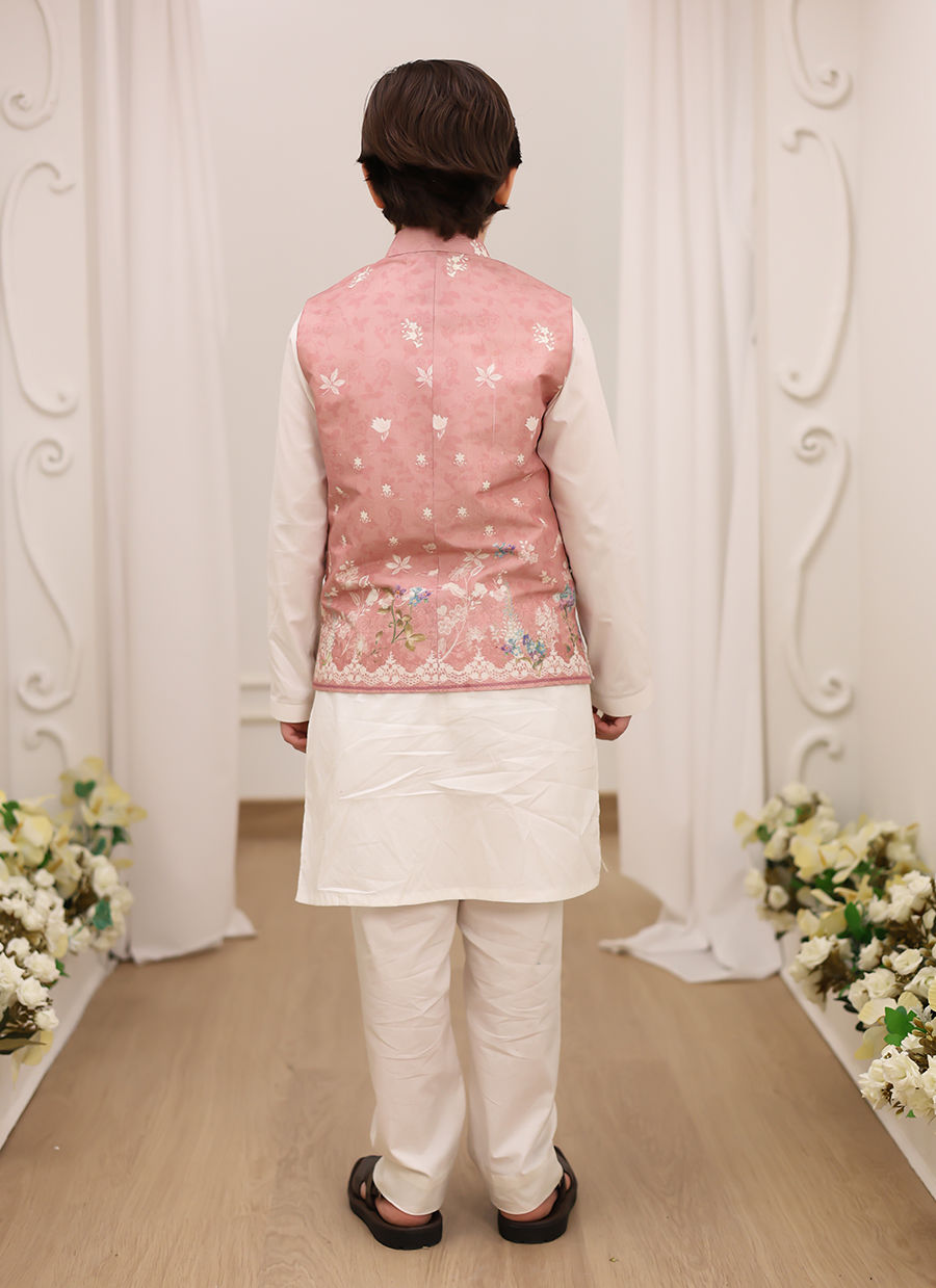 This chai pink soft floral printed raw silk waistcoat for a young boy offers a refined yet playful look, perfect for special occasions. The gentle chai pink hue, paired with a delicate floral print, brings a soft, sophisticated charm to the design. The raw silk fabric is both luxurious and comfortable, with a subtle sheen that adds to its elegant appeal. Tailored to perfection, the waistcoat features a sleek fit, with fine button fastenings and neat stitching details, ensuring a polished appearance. Ideal for pairing with an ivory kurta and shalwar, this waistcoat brings a touch of youthful refinement to any young boy’s wardrobe, offering a perfect balance of traditional style and modern flair.
