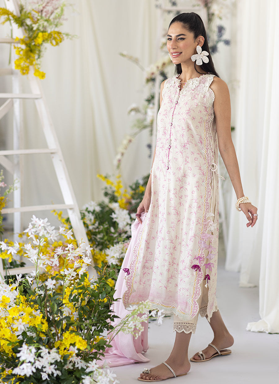 Cut from exclusively hand-woven khaddi silk, this shirt is a soothing ivory, printed with blissfully delicate, blush pink florals. The hem is adorned with a delicate scalloped lace, while the round neckline, adorned with hand stitched 3-D blooms gives a fun, playful feel. The pure medium silk dupatta, completes the ensemble with graceful flair.