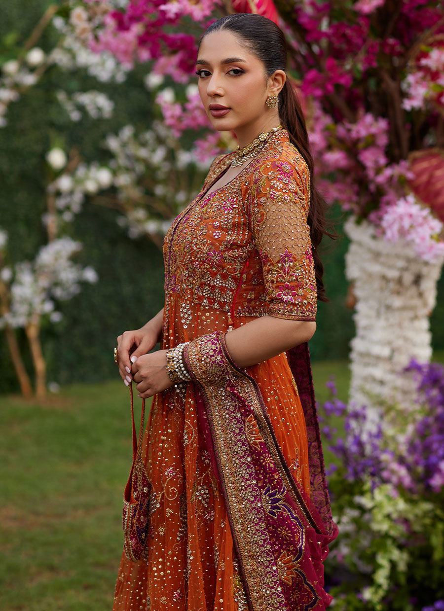 A graceful fusion of warm tones and intricate embellishment, this burnt orange and berry ensemble is crafted for timeless elegance and regal charm. The front-open kalidaar is made from delicate net, featuring a striking jaal design on the bodice and sleeves, embellished with rich zardozi work using kora dabka, sequins, crystals, and resham in soft shades of pink and green. The kalis are adorned with zardozi and resham grapevine motifs, complemented by an all-over sequin spray that adds gentle sparkle. The hemline is finished with a block-printed charmeuse border, layered with a zari edge and further enhanced with detailed zardozi embroidery. Paired with a soft zari tissue lehnga in a complementing tone, the ensemble is completed with an intricately embellished zari border and subtle sequin spray throughout, adding graceful shimmer with every movement. The matching net dupatta ties the look together, featuring zari borders on all four sides and block-printed pallus, elevated with zardozi detailing and scattered sequins for a soft, luminous finish.