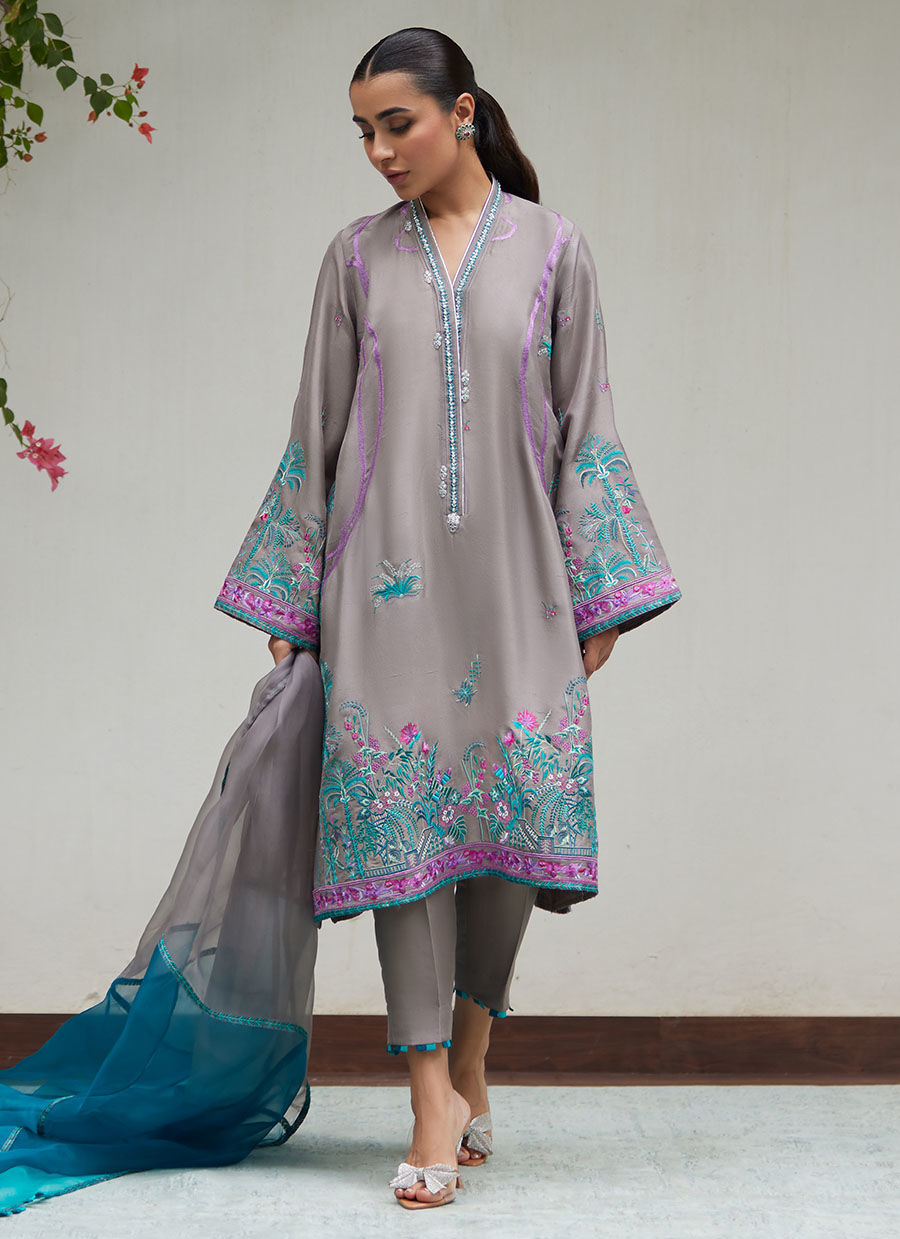 A canvas of deep, dreamy charcoal grey is adorned with stunning composed embroidery in vibrant tones. Delicate florals bloom along the daaman and sleeves, with hand embellished silver embroidery further uplifting the shirt.