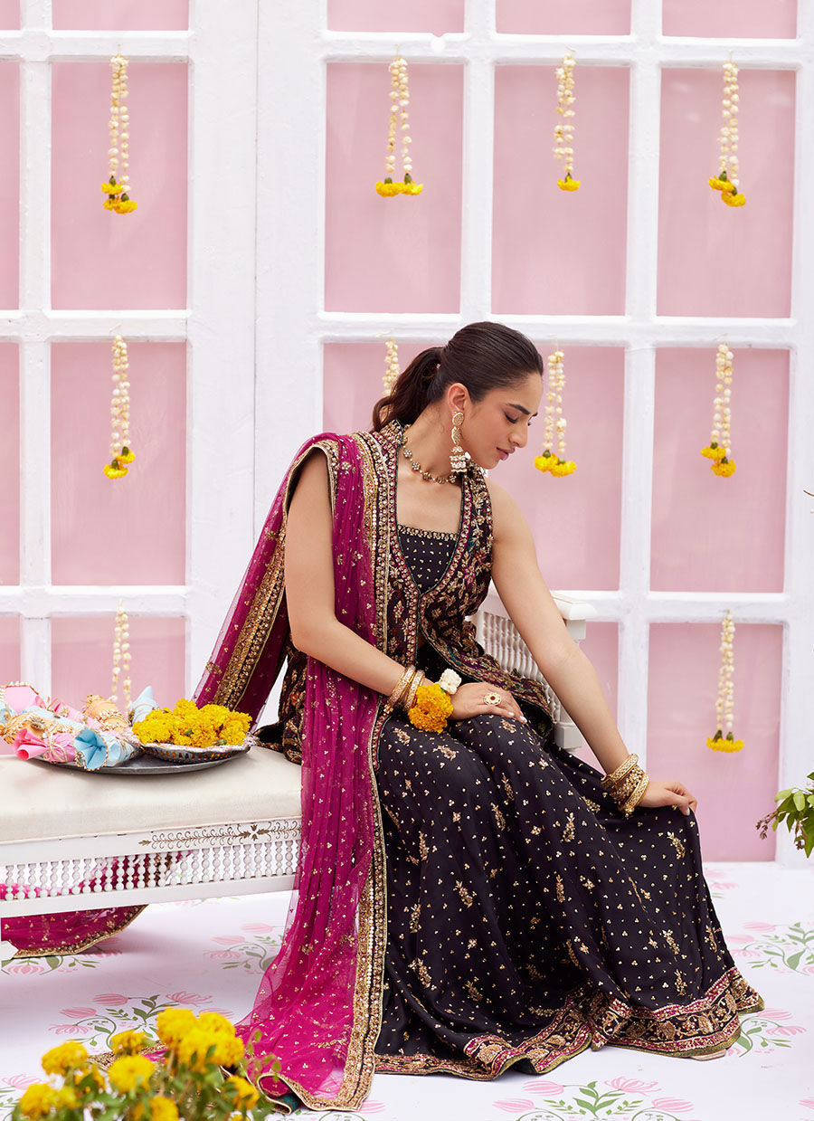 Elevate your festive wardrobe with this stunning three-piece ensemble, a perfect blend of tradition and contemporary flair. The sleeveless jacket-style top, crafted from luxurious Shamoz silk, comes in a rich black base adorned with vibrant shades of pink, green, mustard, beige, and gold. It features a graceful front opening and is intricately embellished with heavy zardozi and antique gold tilla work, beautifully outlining the neckline, front placket, and hem. Delicate resham embroidery in jewel tones forms eye-catching floral motifs, adding depth and color to the design. Paired with flared Dhaka pants in pure raw silk, the look is elevated with subtle gold hand embellishments that bring a touch of opulence to the ensemble. The set is completed with a fuchsia pink net dupatta, detailed with gold sequins and a block print border, adding a vibrant contrast and perfecting the festive appeal.